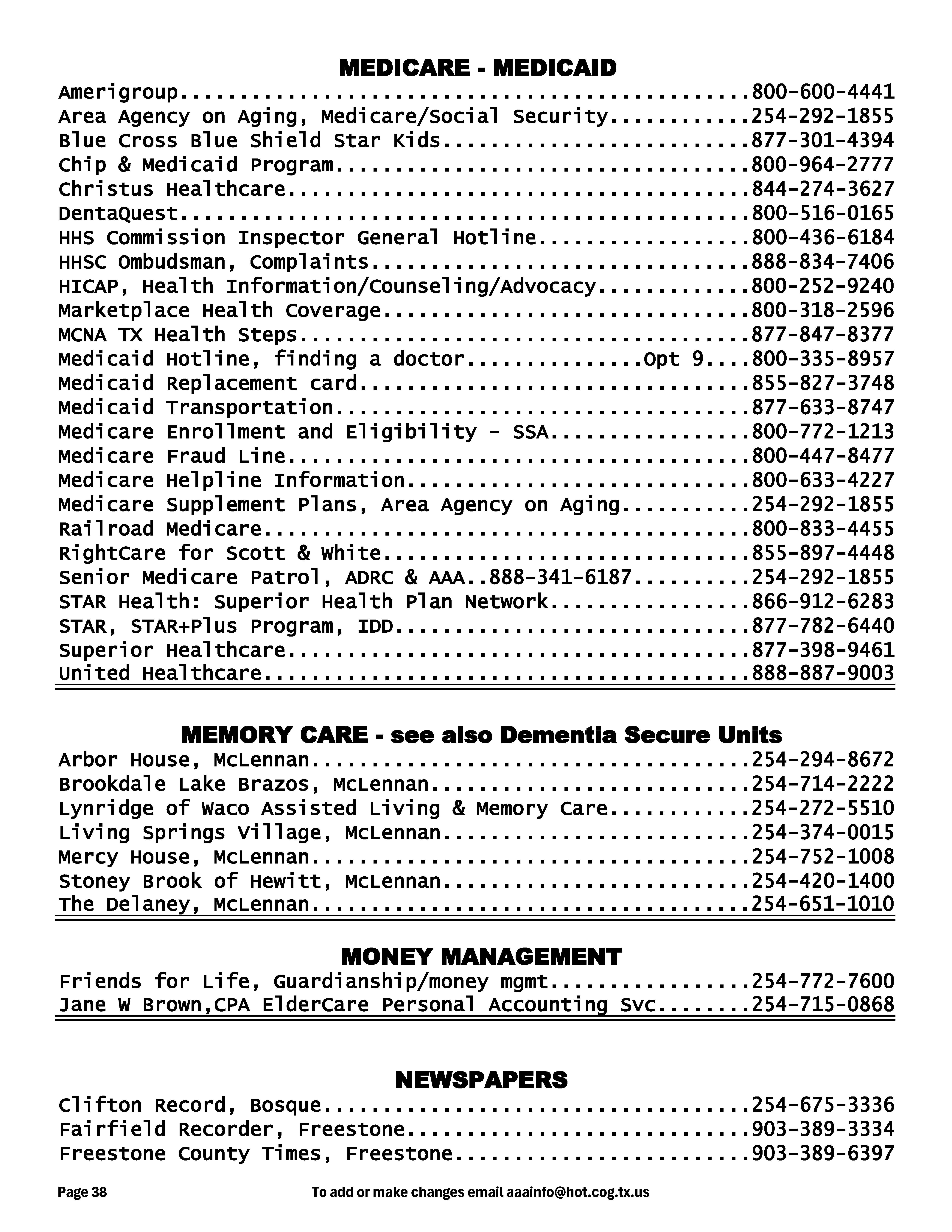 MEDICAID Amerigroup . ............................................... 800-600-4441 Area Agency on Aging, Medicare/social security ............ 254-292-1855 Blue cross Blue shield Star Kids .......................... 877-301-4394 Chip & Medicaid Program ................................... 800-964-2777 christus Healthcare ....................................... 844-274-3627 DentaQuest . ............................................... 800-516-0165 HHS Commission Inspector General Hotline .................. 800-436-6184 HHSC ombudsman, complaints ................................ 888-834-7406 HICAP, Health Information/counseling/Advocacy ............. 800-252-9240 Marketplace Health coverage ............................... 800-318-2596 MCNA TX Health Steps ...................................... 877-847-8377 Medicaid Hotline, finding a doctor ............... Opt 9 .... 800-335-8957 Medicaid Replacement card ................................. 855-827-3748 Medicaid Transportation ................................... 877-633-8747 Medicare Enrollment and Eligibility - SSA ................. 800-772-1213 Medicare Fraud Line ....................................... 800-447-8477 Medicare Helpline Information ............................. 800-633-4227 Medicare supplement Plans, Area Agency on Aging ........... 254-292-1855 Rail road Medi care ......................................... 800-833-4455 Rightcare for Scott & White ............................... 855-897-4448 senior Medicare Patrol, ADRC & AAA .. 888-341-6187 .......... 254-292-1855 STAR Health: superior Health Plan Network ................. 866-912-6283 STAR, STAR+Plus Program, IDD .............................. 877-782-6440 superior Healthcare ....................................... 877-398-9461 united Healthcare ......................................... 888-887-9003 MEMORY CARE - see also Dementia Secure Units Arbor House, McLennan ..................................... 254-294-8672 Brookdale Lake Brazos, McLennan ........................... 254-714-2222 Lynridge of Waco Assisted Living & Memory care ............ 254-272-5510 Living Springs village, McLennan .......................... 254-374-0015 Mercy House, McLennan ..................................... 254-752-1008 Stoney Brook of Hewitt, McLennan .......................... 254-420-1400 The Delane, McLennan ..................................... 254-651-1010 MONEY MANAGEMENT Friends for Life, Guardianship/money mgmt ................. 254-772-7600 Jane w Brown,CPA Eldercare Personal Accounting svc ........ 254-715-0868 NEWSPAPERS Clifton Record, Bosque .................................... 254-675-3336 Fairfield Recorder, Freestone ............................. 903-389-3334 Freestone county Times, Freestone ......................... 903-389-6397 Page as To add or make changes email aaainfo@hot.cog.tx.us