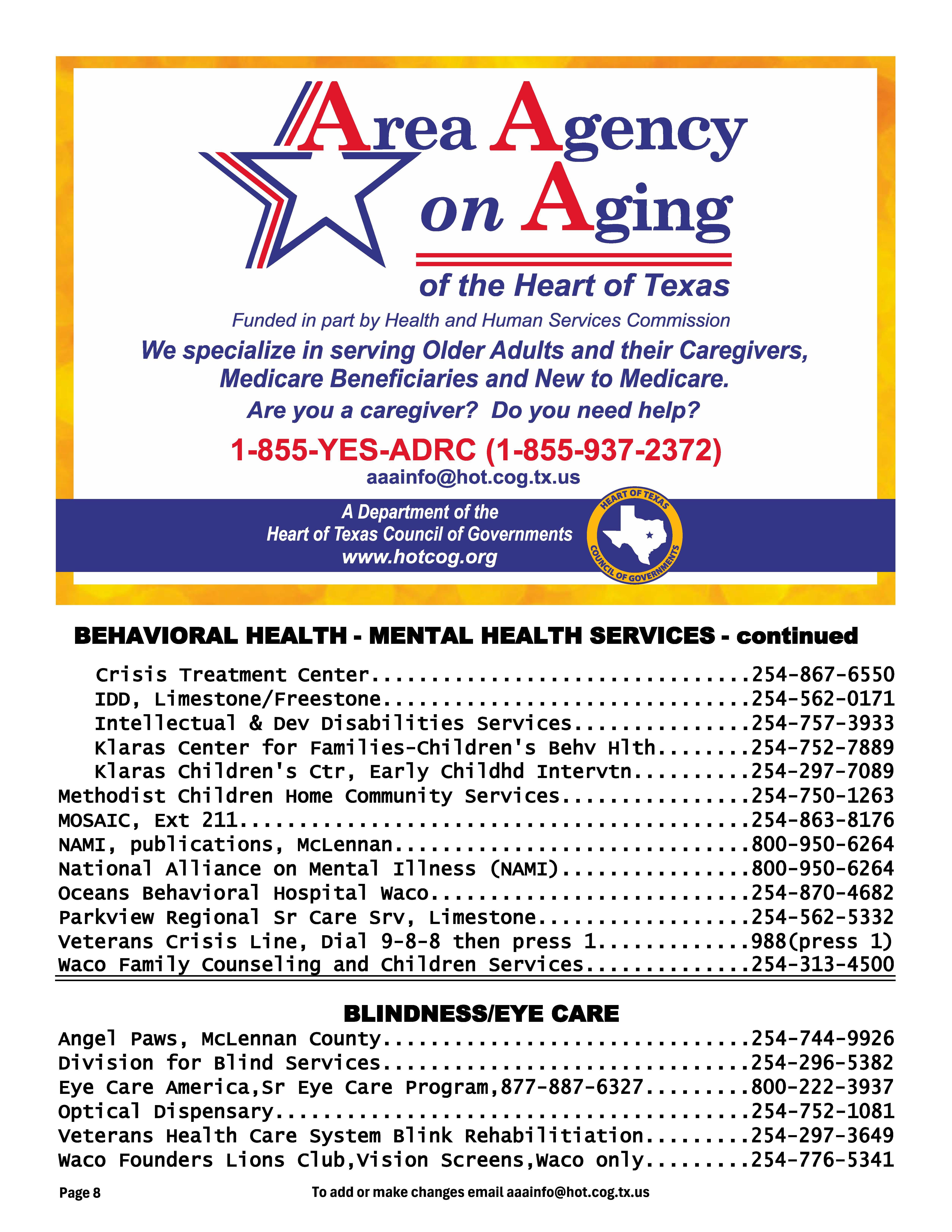 /A rea A gency on A ging of the Heart of Texas Funded in part by Health and Human Services Commission We specialize in serving Older Adults and their Caregivers, Medicare Beneficiaries and New to Medicare. Are you a caregiver? Do you need help? 1-855-YES-ADRC (1-855-937-2372) aaainfo@hot.cog.tx us BEHAVIORAL HEALTH - MENTAL HEALTH SERVICES - continued Crisis Treatment Center ................................ 254-867-655O IDD, Limestone/Freestone ............................... 254-562-O171 Intellectual & Dev Disabilities services ............... 254-757-3933 Klaras center for Families-children's Behv Hlth ........ 254-752-7889 Klaras children's Ctr, Early childhd Intervtn .......... 254-297-7O89 Methodist children Home community services ................ 254-75O-1263 MOSAIC, Ext 211 ........................................... 254-863-8176 NAMI, publications, McLennan .............................. 8OO-95O-6264 National Alliance on Mental Illness (NAMI) ................ 8OO-95O-6264 oceans Behavioral Hospital waco ........................... 254-87O-4682 Parkview Regional Sr care srv, Limestone .................. 254-562-5332 veterans crisis Line, Dial 9-8-8 then press 1 ............. 988(press 1) Waco Family counseling and Children services .............. 254-313-45OO