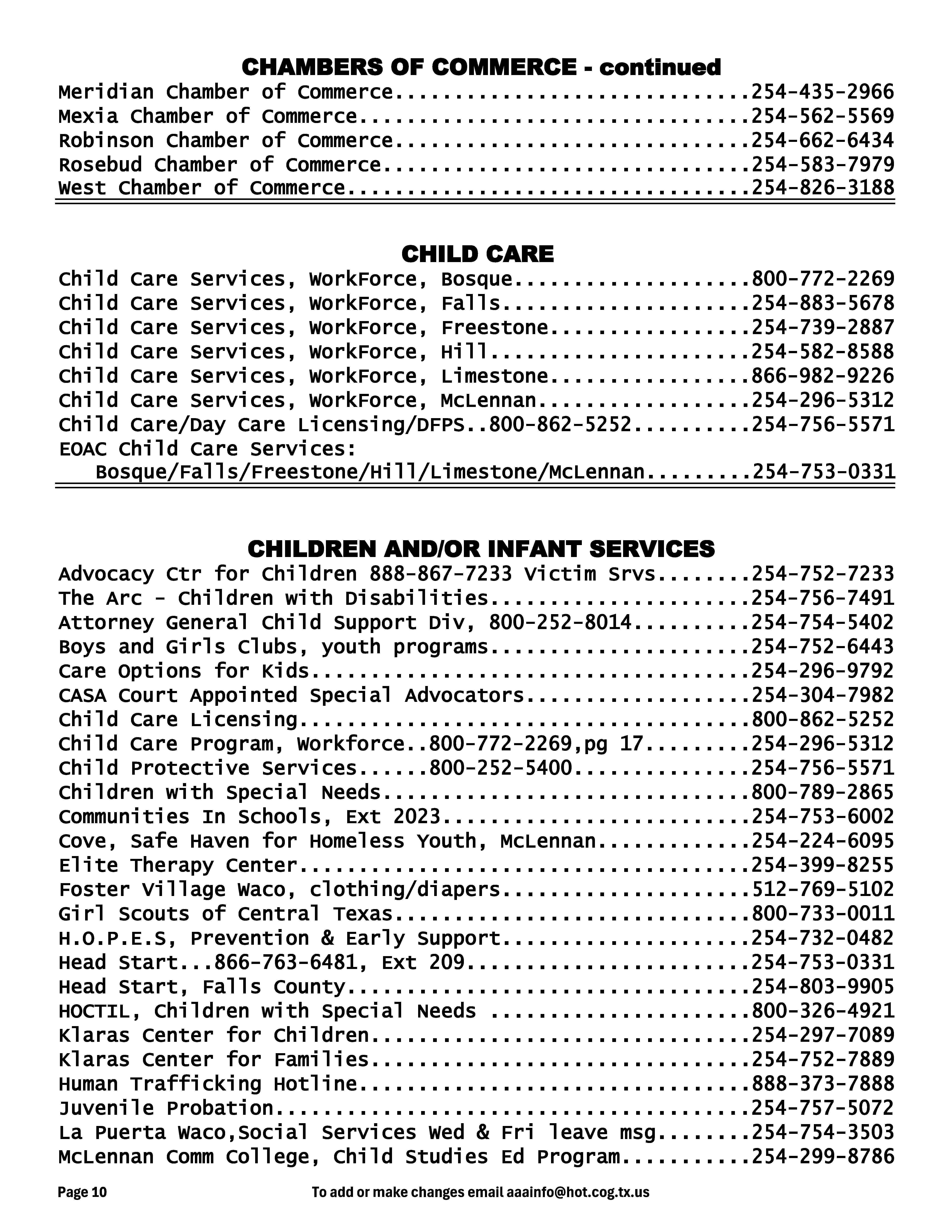 Advocacy Ctr for children 888-867-7233 victim srvs ........ 254-752-7233 The Arc - children with Disabilities ...................... 254-756-7491 Attorney General child support Div, 800-252-8014 .......... 254-754-5402 Boys and Girls clubs, youth programs ...................... 254-752-6443 care options for Kids ..................................... 254-296-9792 CASA court Appointed special Advocators ................... 254-304-7982 child care Licensing ...................................... 800-862-5252 child care Program, workforce .. 800-772-2269,pg 17 ......... 254-296-5312 child Protective services ...... 800-252-5400 ............... 254-756-5571 children with special Needs ............................... 800-789-2865 communities In schools, Ext 2023 .......................... 254-753-6002 cove, safe Haven for Homeless Youth, McLennan ............. 254-224-6095 Elite Therapy Center ...................................... 254-399-8255 Foster Village Waco, clothing/diapers ..................... 512-769-5102 Girl scouts of central Texas .............................. 800-733-0011 H.O.P.E.S, Prevention & Early support ..................... 254-732-0482 Head start ... 866-763-6481, Ext 209 ........................ 254-753-0331 Head start, Falls county .................................. 254-803-9905 HOCTIL, Children with Special Needs ...................... 800-326-4921 Klaras center for children ................................ 254-297-7089 Klaras center for Families ................................ 254-752-7889 Human Trafficking Hotline ................................. 888-373-7888 Juvenile Probation ........................................ 254-757-5072 La Puerta waco,social services wed & Fri leave msg ........ 254-754-3503 McLennan comm college, child studies Ed Program ........... 254-299-8786 Page 10 To add or make changes email aaainfo@hot.cog.tx.us