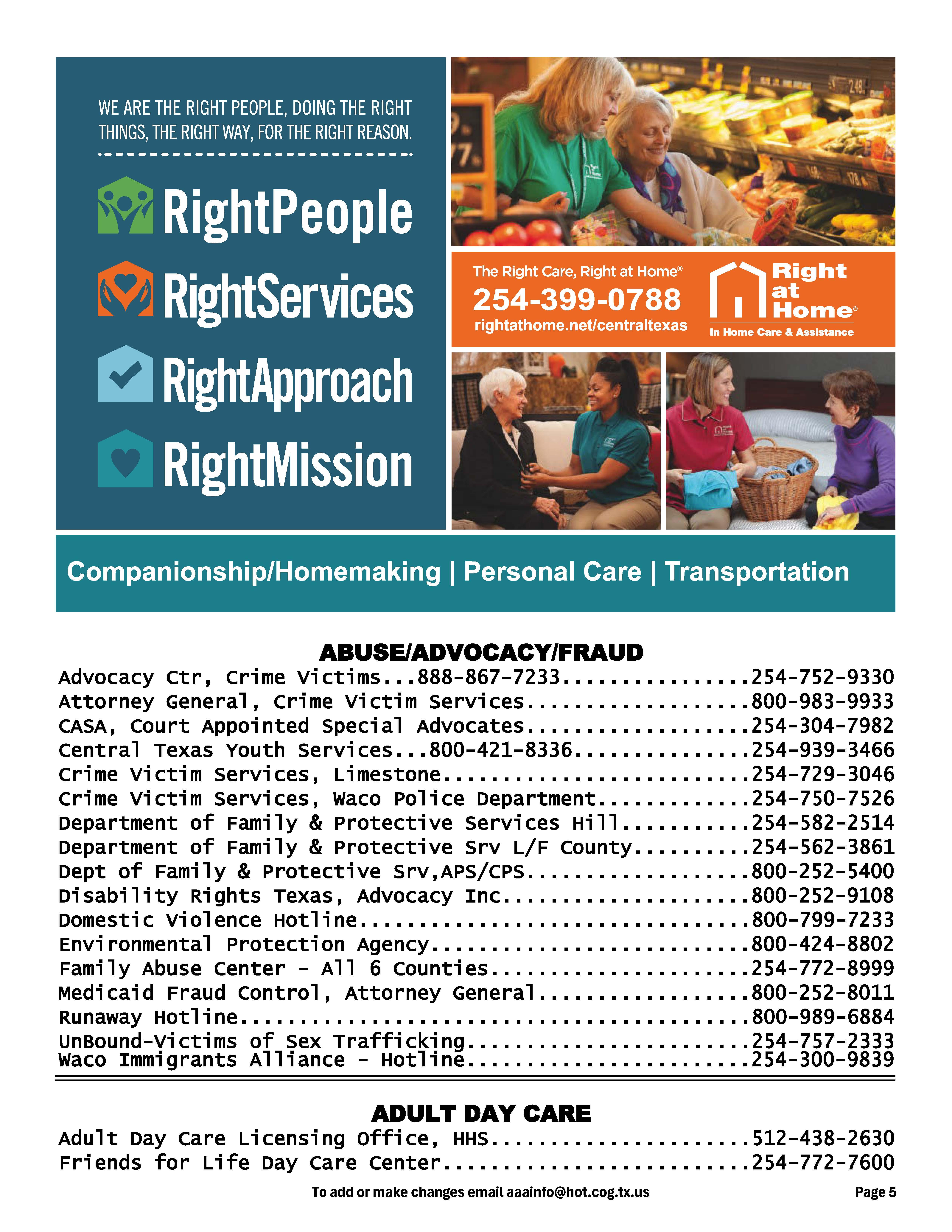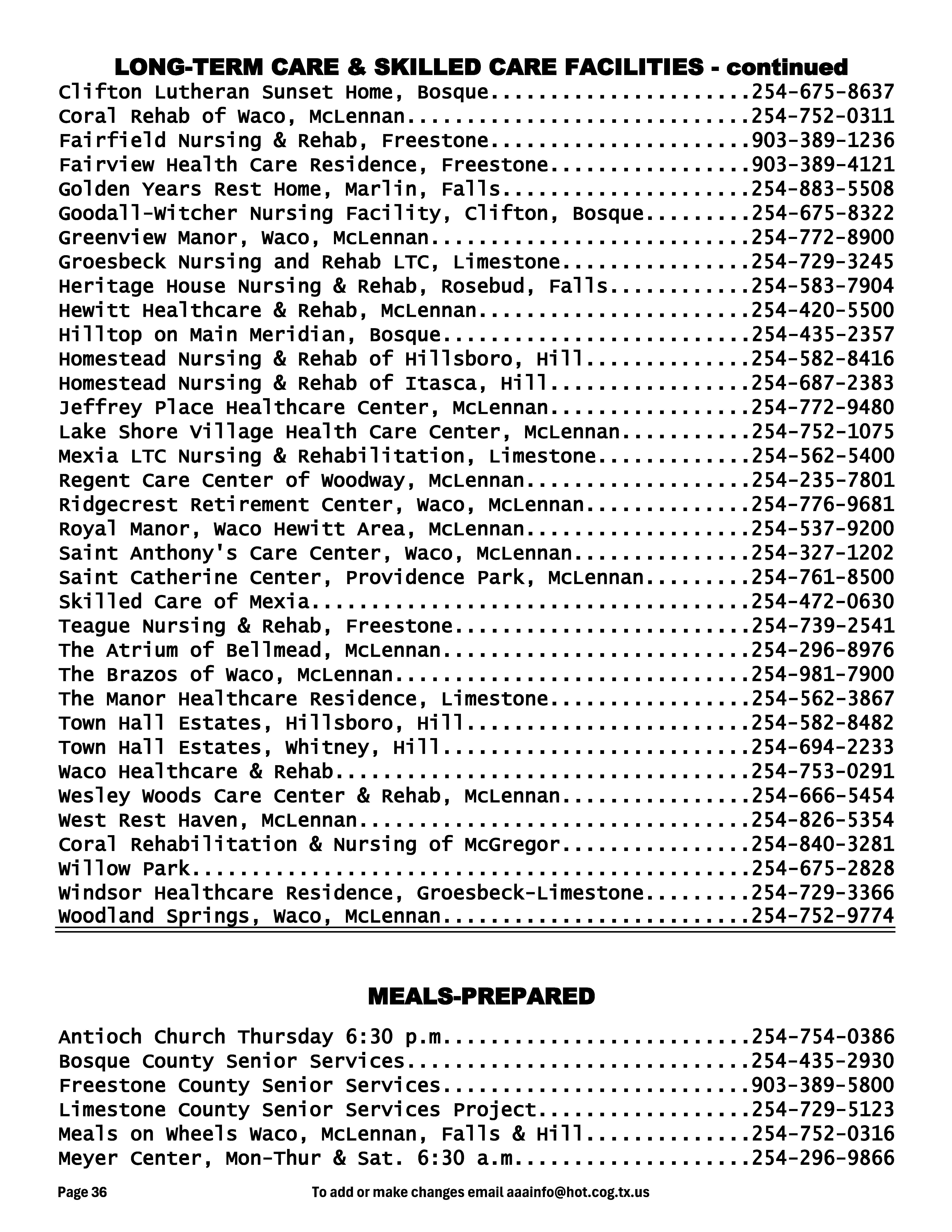 continued Homestead Nursing & Rehab of Hillsboro .................... 254-582-8416 Homestead Nursing & Rehab of Itasca ....................... 254-687-2383 AGING SERVICES AAA, Area Agency on Aging, see ad on page 8 ............... 254-292-1855 AARP Information .......................................... 888-687-2277 ADRC, Aging & Disability Resource ctr, ad pg 12 ........... 254-292-1855 Adult Protective services ................................. 800-252-5400 Burgett Law Firm, Elder Law ............................... 254-218-6288 Elder care Locator ........................................ 800-677-1116 Foster Grandparent Program, Stipend available ............. 254-562-4257 Friends for Life .......................................... 254-772-7600 Grandparents as Parents, Methodist Home ................... 254-750-1263 cherry Johnson seigmund James: Elder Law .................. 254-732-2242 Meals on wheels Waco, Home Delivered Meals ................ 254-752-0316 Naman Howell smith & Lee, Elder Law ....................... 254-755-4100 Nursing Home complaint Hotline, HHSC ...................... 800-458-9858 Rainey & Rainey, Elder Law, see ad p 13 ................... 254-752-8644 TX Health and Human services, Bosque ...................... 254-435-2302 TX Health and Human services, Falls ....................... 254-883-3555 TX Health and Human services, Freestone ................... 254-562-3861 TX Health and Human services, Hill ........................ 254-582-5321 TX Health and Human services, Limestone ................... 254-562-3861 TX Health and Human services, McLennan .................... 254-752-4839 AGRI-LIFE