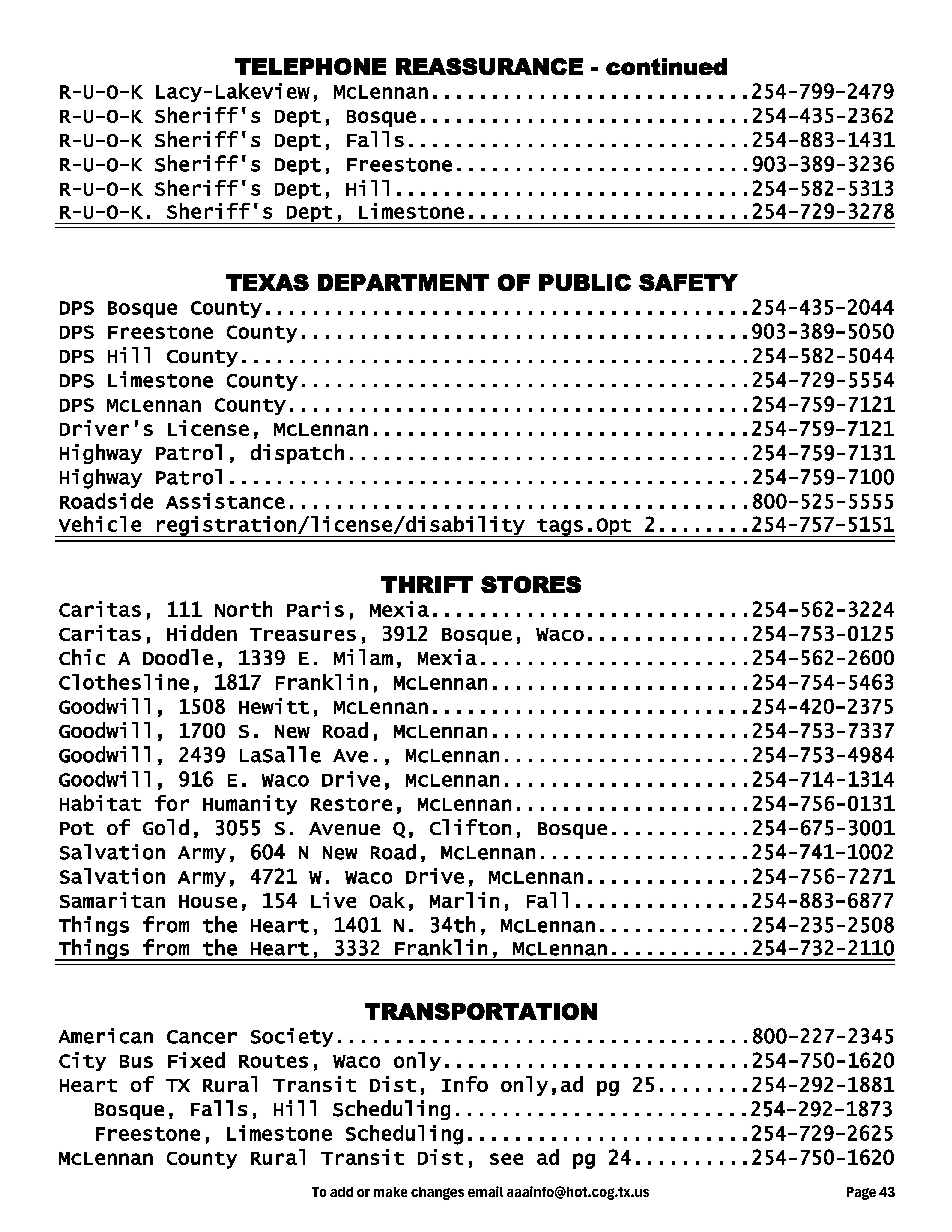 American cancer society ................................... 800-227-2345 city Bus Fixed Routes, Waco only .......................... 254-750-1620 Heart of TX Rural Transit Dist, Info only,ad pg 25 ........ 254-292-1881 Bosque, Falls, Hill scheduling ......................... 254-292-1873 Freestone, Limestone scheduling ........................ 254-729-2625 McLennan county Rural Transit Dist, see ad pg 24 .......... 254-750-1620 To add or make changes email aaainfo@hot.cog.tx.us Page43