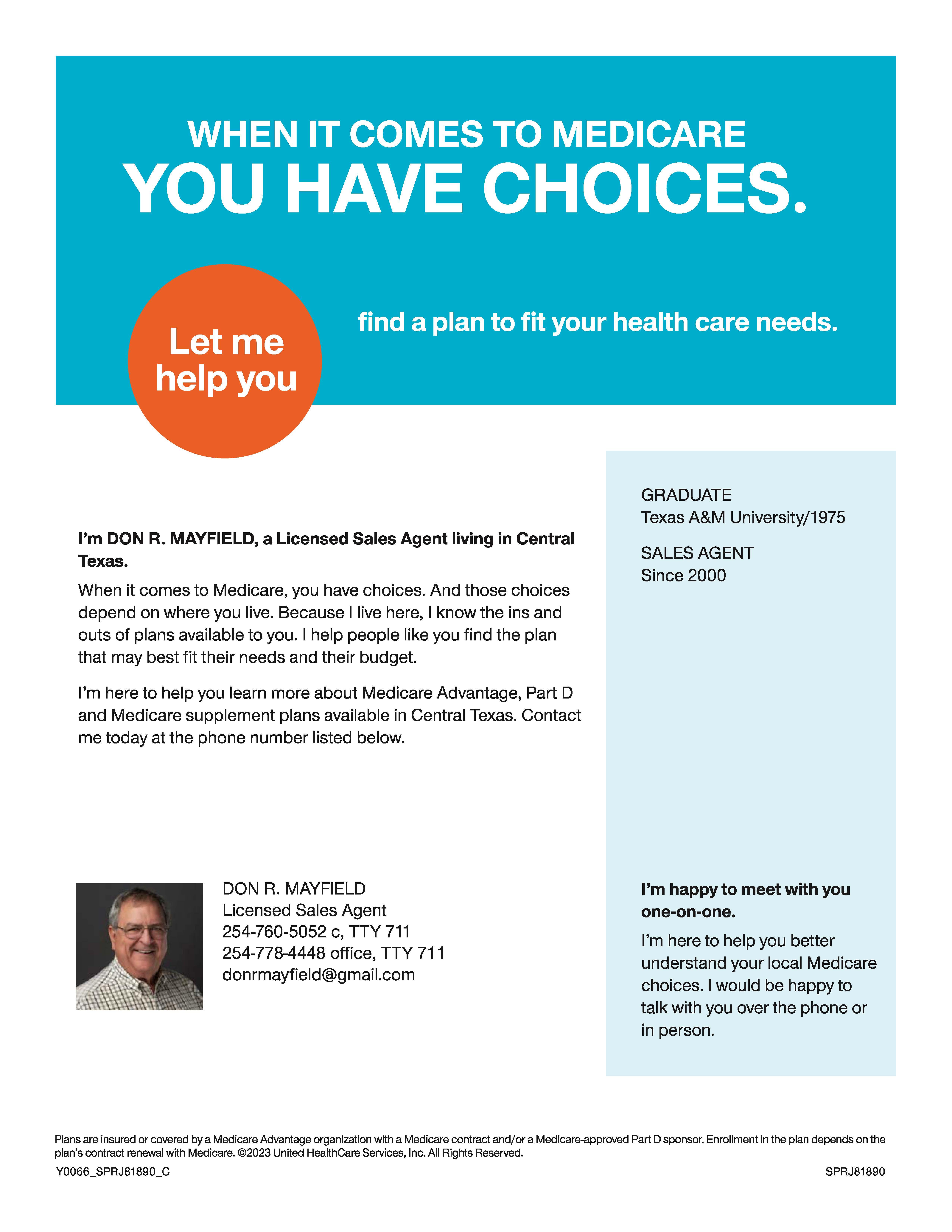 INSURANCE - MEDICARE RELATED LICENSED INDEPENDENT INSURANCE AGENTS - continued united Healthcare Don Mayfield ............................ 254-76O-5O52 united Healthcare Jane Cruz Jimenez ....................... 254-661-7349 united Healthcare Kenneth Ta lor .......................... 254-34O-O716 INSURANCE PAPERWORK/BENEFITS ASSISTANCE Area Agency on Aging,Medicare/social security help ......... 254-292-1855 caritas, HELPINGS ......................................... 254-753-4593 HICAP, Health Information/counseling/Advocacy ............. 254-292-1855 seniors complete Insurance & Financial Agency ............. 254-776-72OO Texas De artment of Insurance ............................. 8OO-252-3439 INTELLECTUAL & DEVELOPMENTAL DISABILITIES The Arc of McLennan county ................................ 254-756-7491 Heart of Texas Autism Network ............................. 254-862-1131 HOT Behavioral Health Network center, all counties ........ 254-752-3451 HOT Behavioral Health Network center, Mexia ............... 254-562-O171 LEGAL ASSISTANCE/LEGAL AWARENESS American Gateways, Immigration matters, Falls ............. 512-478-O546 Area Agency on Aging, Medicare/social security ............ 254-292-1855 To add or make changes email aaainfo@hot cog tx us Page33