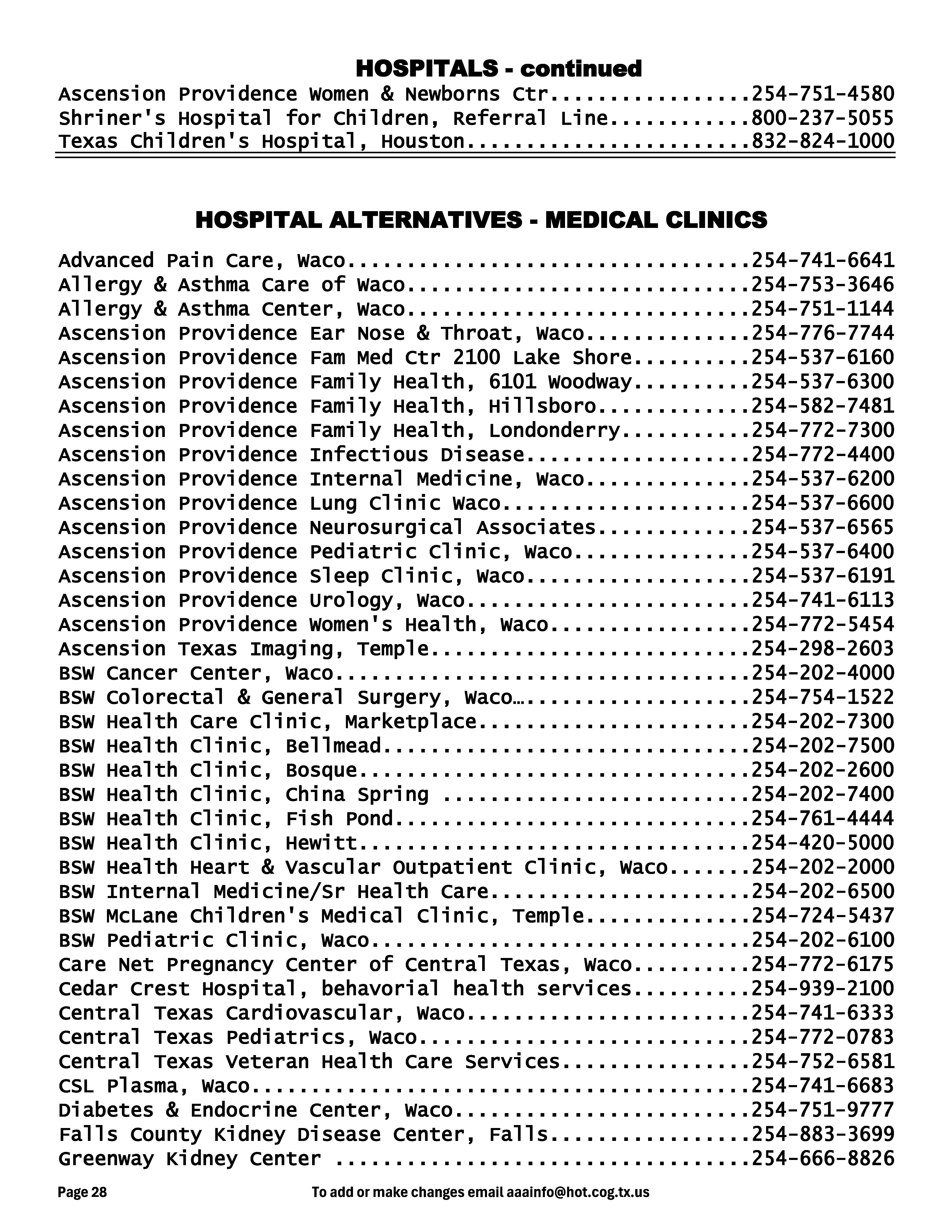 Baylor s&w Mclane Children's Med Ctr, Temple .............. 877-724-5437 Baylor s&w Medical Ctr, Hillcrest, waco ................... 254-202-2000 Baylor women & Children center, waco ...................... 254-313-6500 cedar crest Hospital, behavorial health services .......... 254-939-2100 central Texas veterans Healthcare Hosp, Temple ............ 800-423-2111 Coryell Memorial Hospital, Gatesville ..................... 254-865-8251 Falls community Hospital & Health clinic, Falls ........... 254-803-3561 Freestone Medical center, Fairfield ....................... 903-389-1600 Goodall Witcher Hospital, clifton ......................... 254-675-8322 Fish Pond surgery ctr, waco ............................... 254-751-9836 Hill Regional Hospital, Hillsboro ......................... 254-580-8500 Limestone Medical center, Groesbeck ....................... 254-729-3281 oceans Behavioral Hospital waco ........................... 254-870-4682 Parkview Regional Hospital, Mexia ......................... 254-562-5332 Ascension Providence DePaul center ........................ 254-776-5970 Ascension Providence Hospital, waco ....................... 254-751-4000 To add or make changes email aaainfo@hot.cog.tx.us Page27