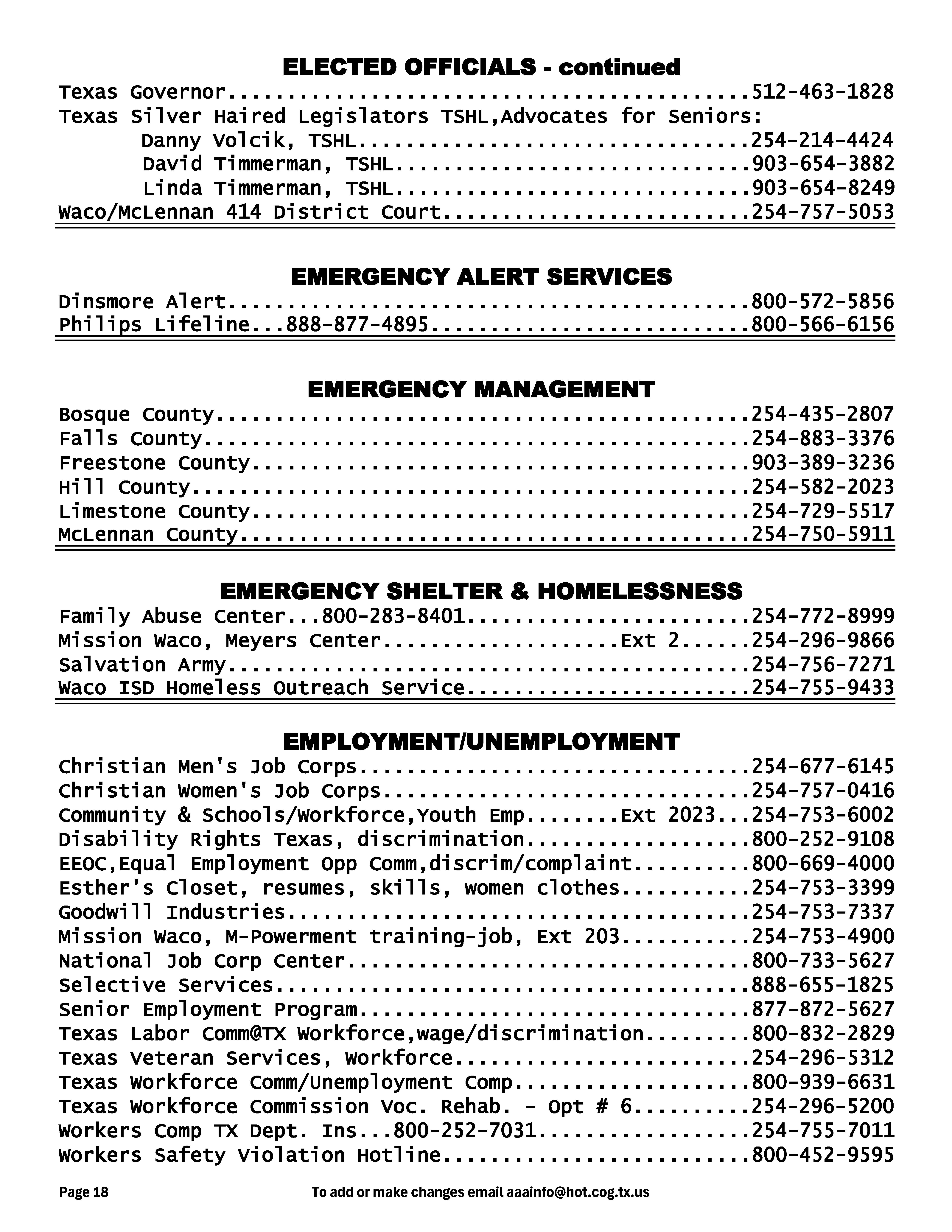 ELECTED OFFICIALS - continued Texas Governor ............................................ 512-463-1828 Texas silver Haired Legislators TSHL,Advocates for seniors: Danny volcik, TSHL ................................. 254-214-4424 David Timmerman, TSHL .............................. 903-654-3882 Linda Timmerman, TSHL .............................. 903-654-8249 Waco/McLennan 414 District court .......................... 254-757-5053 EMERGENCY ALERT SERVICES Dinsmore Alert ............................................ 800-572-5856 Philis Lifeline ... 888-877-4895 ........................... 800-566-6156 EMERGENCY
