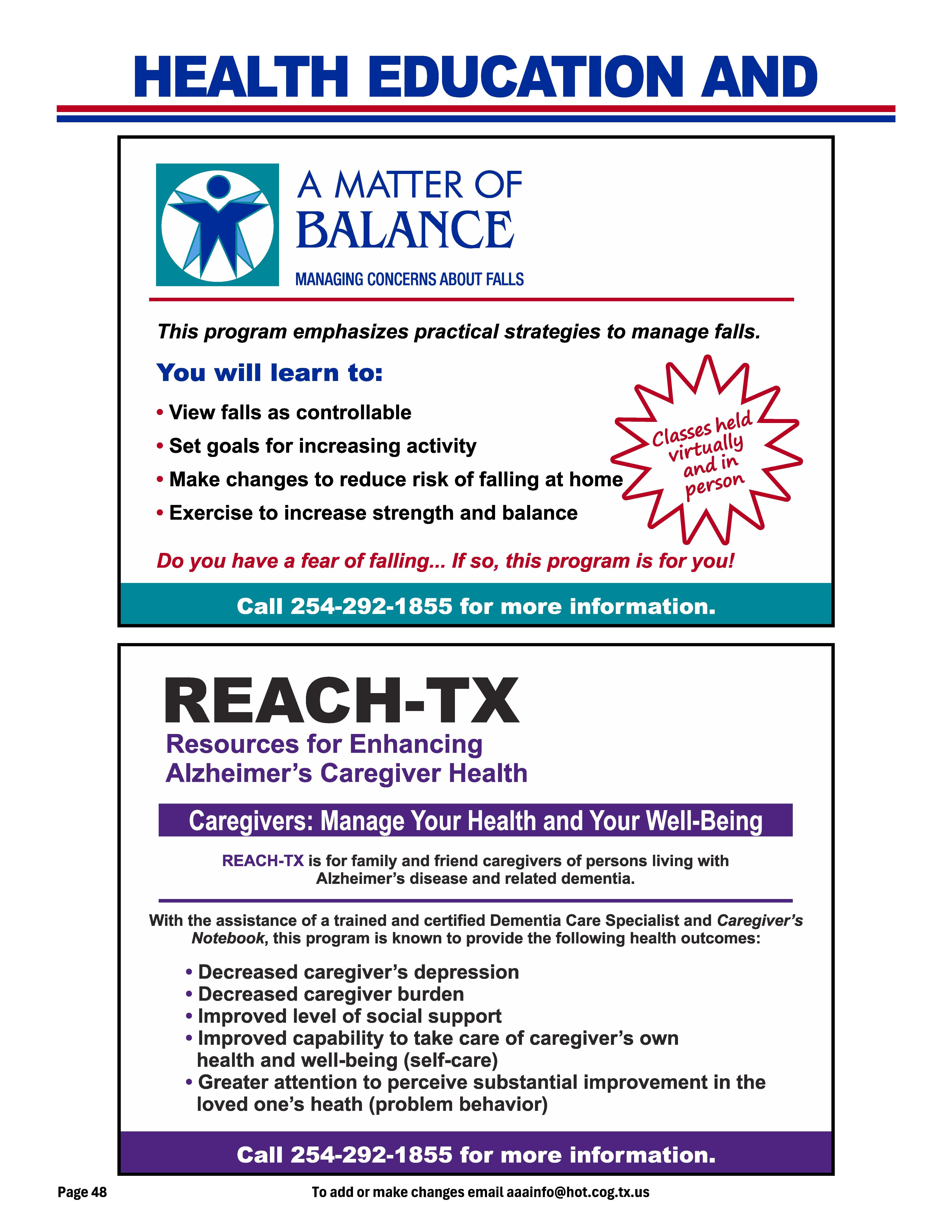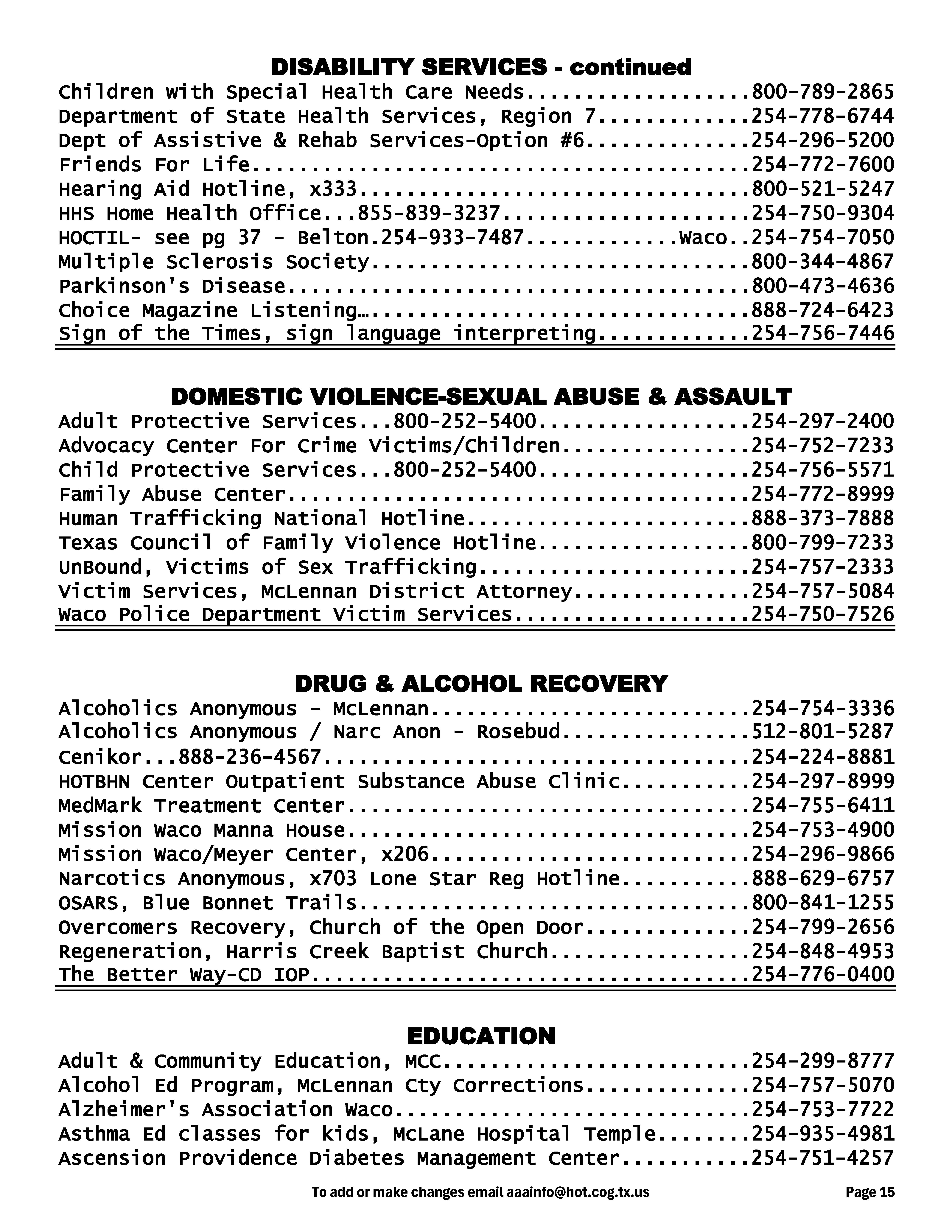 ADRC, Aging & Disability Resource ctr, seep 12 ........... 254-292-1855 Alzheimer's Association Waco office ....................... 254-753-7722 American Lung Association ................................. 800-548-8252 The Arc - Persons with Disabilities ....................... 254-756-7491 ARCIL . 800-414-6327 Arthritis Foundation ...................................... 800-283-7800 Page 14 To add or make changes email aaainfo@hot.cog.tx.us