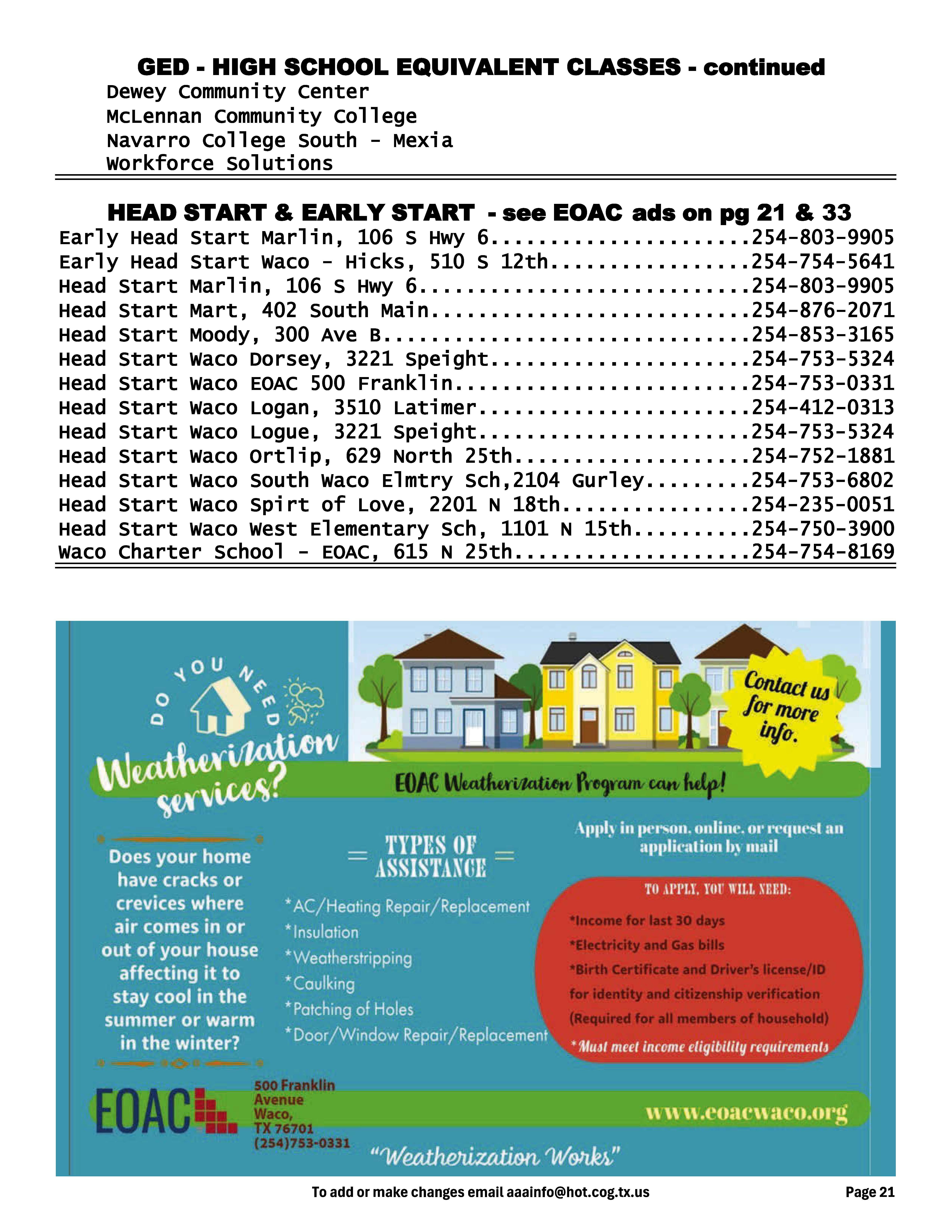 EOAC, weatherization Program, see ad pg 21 ................ 254-753-0331 WOMEN INFANTS