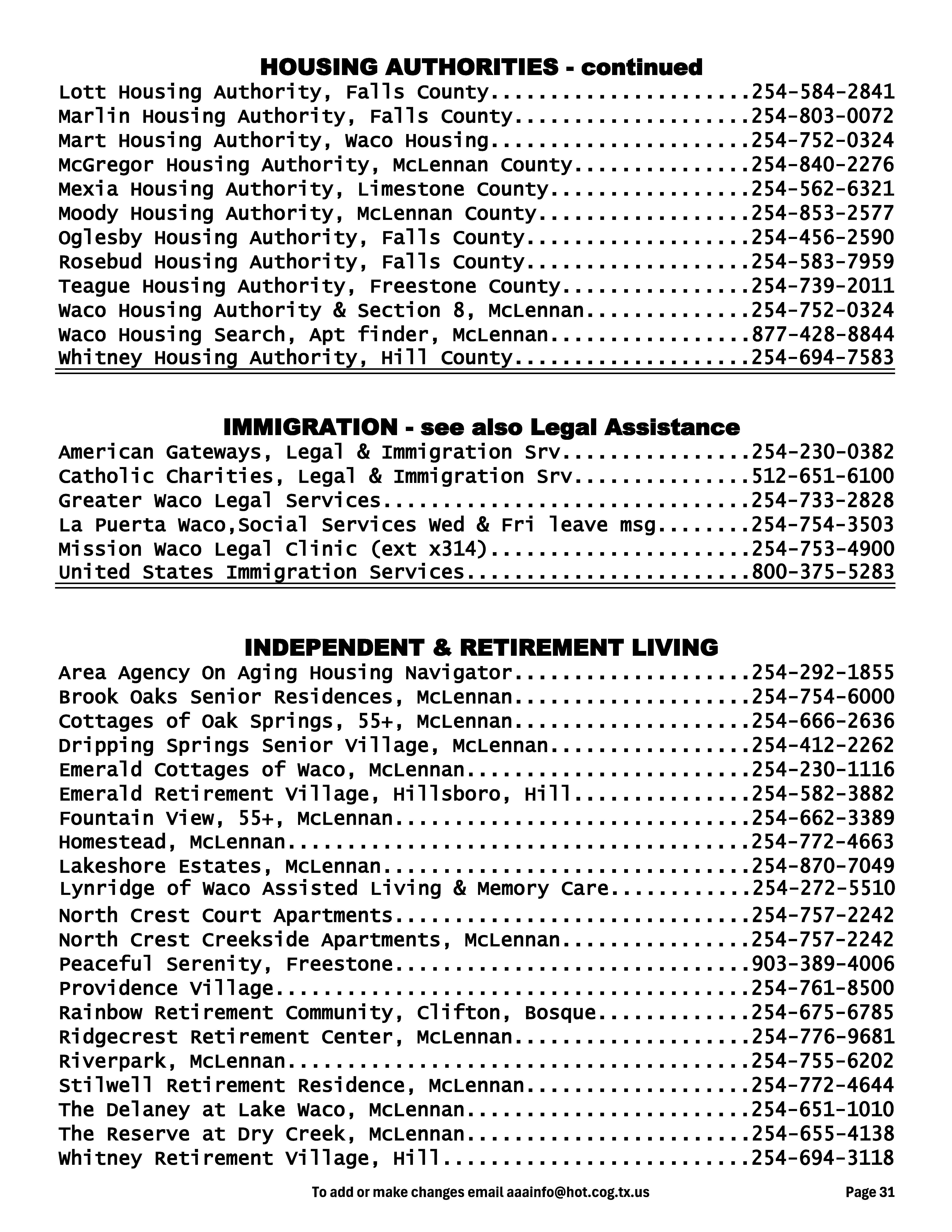 Clifton Housing Authority, Bosque county .................. 254-675-8294 Coolidge Housing Authority, Limestone county .............. 254-786-2450 Cranfills Gap Housing Development, Bosque county .......... 254-597-2414 Hillsboro Housing Authority/section 8 Waco Housing ........ 254-782-8558 HOPWA-Housing Opportunities for Person's with AIDS ........ 254-750-5499 Housing Authority of Meridian, Bosque county .............. 254-435-2601 Hubbard Housing Authority, Waco Housing ................... 254-576-2932 Liberty Housing Alliance, Limestone county ................ 254-729-3204 Pageao To add or make changes email aaainfo@hot.cog.tx.us