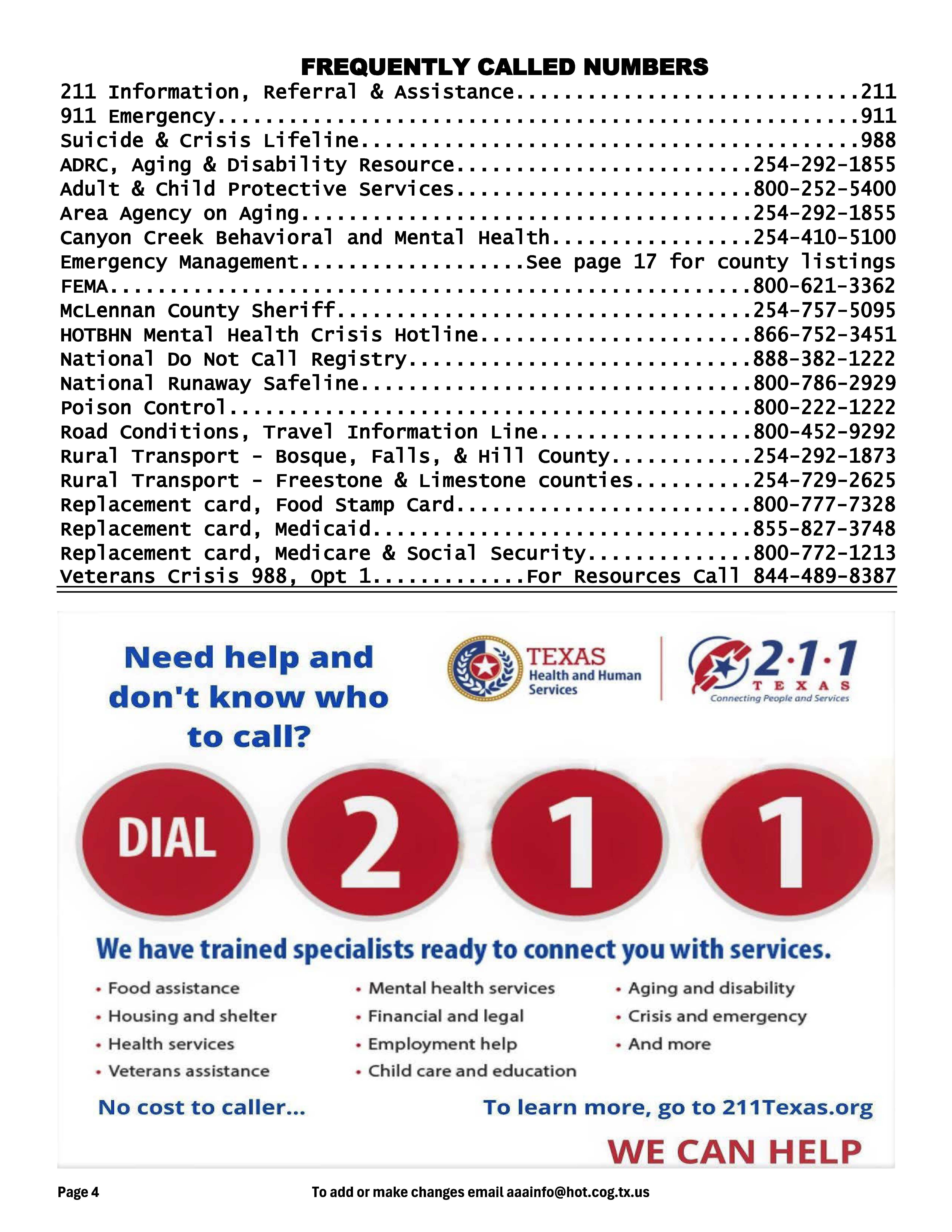 FREQUENTLY CALLED NUMBERS 211 Information, Referral & Assistance ............................. 211 911 Emergency ...................................................... 911 suicide & crisis Lifeline .......................................... 988 ADRC, Aging & Disability Resource ......................... 254-292-1855 Adult & child Protective services ......................... 800-252-5400 Area Agency on Aging ...................................... 254-292-1855 canyon creek Behavioral and Mental Health ................. 254-410-5100 Emergency Management ................... see page 17 for county listings FEMA 800-621-3362 McLennan county sheriff ................................... 254-757-5095 HOTBHN Mental Health Crisis Hotline ....................... 866-752-3451 National Do Not call Registry ............................. 888-382-1222 National Runaway safeline ................................. 800-786-2929 Poison control ............................................ 800-222-1222 Road conditions, Travel Information Line .................. 800-452-9292 Rural Transport - Bosque, Falls, & Hill county ............ 254-292-1873 Rural Transport - Freestone & Limestone counties .......... 254-729-2625 Replacement card, Food stamp card ......................... 800-777-7328 Replacement card, Medicaid ................................ 855-827-3748 Replacement card, Medicare & social security .............. 800-772-1213 Veterans Crisis 988, Opt 1 ............. For Resources call 844-489-8387 Need help and don·t know who to call? TEXAS Health and Human Services @l-! : l Connecting Peop e and Service-s We have trained specialists ready to connect you with services. • Food assistance • Mental health services • Aging and disability • Housing and shelter • Financial and legal • Crisis and emergency • Health services • Employment help • And more • Veterans assistance • Child care and education No cost to caller . . . To learn more, go to 211Texas . org WE CAN HELP Page4 To add or make changes email aaainfo@hot cog tx us