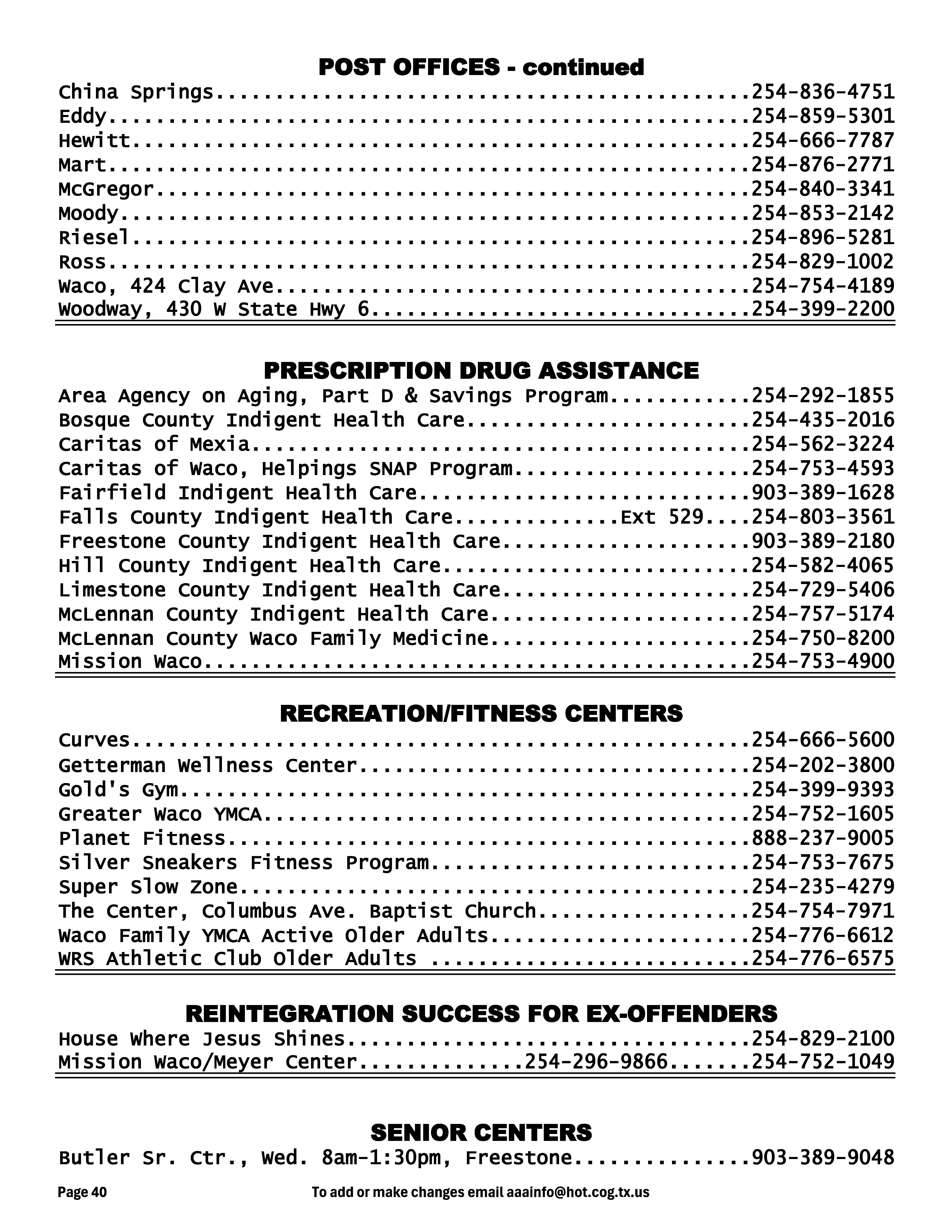 Area Agency on Aging, Part D & savings Program ............ 254-292-1855 Bosque county Indigent Health care ........................ 254-435-2016 caritas of Mexia .......................................... 254-562-3224 caritas of Waco, Helpings SNAP Program .................... 254-753-4593 Fairfield Indigent Health care ............................ 903-389-1628 Falls county Indigent Health care .............. Ext 529 .... 254-803-3561 Freestone county Indigent Health care ..................... 903-389-2180 Hill county Indigent Health care .......................... 254-582-4065 Limestone county Indigent Health care ..................... 254-729-5406 McLennan county Indigent Health care ...................... 254-757-5174 McLennan county Waco Family Medicine ...................... 254-750-8200 Mission Waco .............................................. 254-753-4900 RECREATION/FITNESS CENTERS curves . ................................................... 2 54-666-5600 Getterman wellness center ................................. 254-202-3800 Gold's Gym ................................................ 254-399-9393 Greater Waco YMCA ......................................... 254-752-1605 Planet Fitness ............................................ 888-237-9005 silver sneakers Fitness Program ........................... 254-753-7675 super slow zone ........................................... 254-235-4279 The center, Columbus Ave. Baptist church .................. 254-754-7971 Waco Family YMCA Active older Adults ...................... 254-776-6612 WRS Athletic Club Older Adults ........................... 254-776-6575 REINTEGRATION SUCCESS FOR EX-OFFENDERS House where Jesus Shines .................................. 254-829-2100 Mission Waco/Meyer center .............. 254-296-9866 ....... 254-752-1049 SENIOR CENTERS Butler Sr. ctr., wed. 8am-1:30pm, Freestone ............... 903-389-9048 Page40 To add or make changes email aaainfo@hot.cog.tx.us