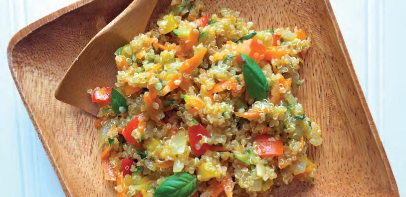 2. In a large nonstick skillet, heat oil over medium heat. Cook onion and garlic for 3 minutes or until softened. Stir in carrot, zucchini, red and yellow peppers and cook for 5 minutes or until tender crisp. Add pepper. Stir into quinoa mixture with basil.