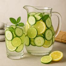 Bring the spa home with this refreshing water infused with crisp cucumber, citrus slices and cooling mint. (Image created using AI.)