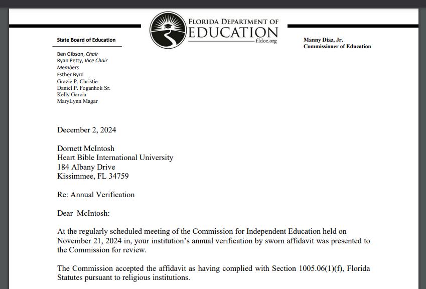 Under Florida Statute 1005 6 (1)(f) and Rule 6E-5 001 HBIU is recognized as an Independent Educational Organization given the right to offer educational programs and grant degrees in all of the following professional and vocational categories and more: Ministry, Counseling, Theology, Divinity, Education, Administration, Music, Fine Arts, Media, Communications, and Social Work. etc.