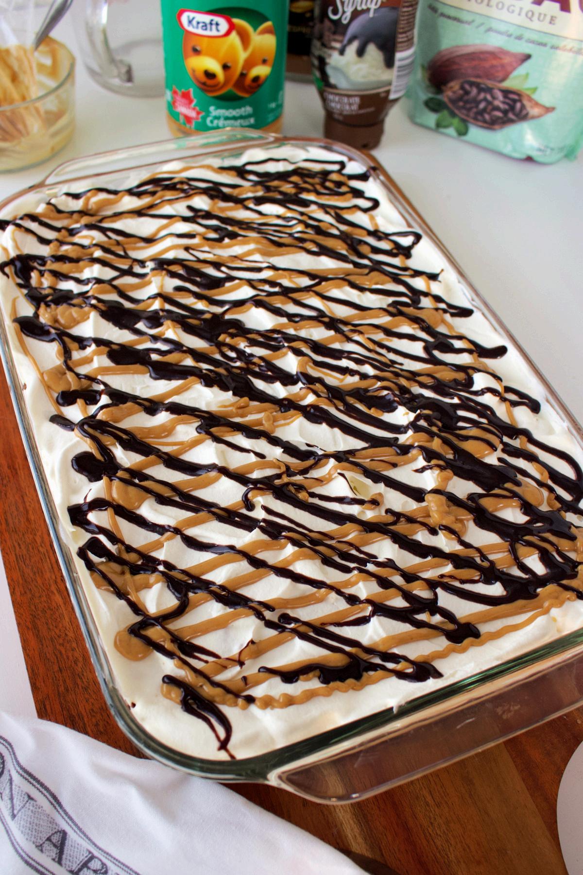 Snip off one of the corners of the bag, and drizzle peanut butter over the whipped topping. Drizzle chocolate sauce over the peanut butter