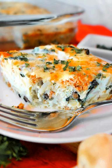 Packed with savoury sausage, mushrooms, vibrant green onions, healthy spinach, hashbrowns, and a rich blend of feta and cheddar cheeses, this breakfast bake is a symphony of flavors that will kickstart your day on a delicious note