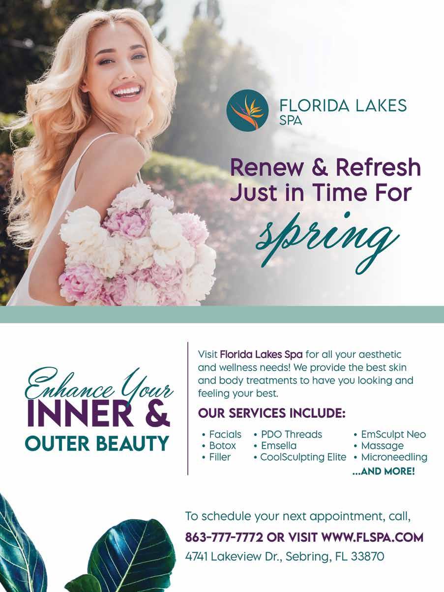 100 Heartland LIVINGMagazine.com www.LakesideDermatology.com WINTER HAVEN (863) 293-SKIN 400 Avenue K SE Suite 3 & All of your Skin care needs Gift Certificates Available General Dermatology: MOHS Micrographic Surgery Skin Cancer Screening & Treatment Mole Removal SEBRING (863) 385-7183 727 US Hwy 27 S Cosmetic Dermatology: Botox Dysport Fillers: Restylane Lyft, Restylane Kysse and Lip Enhancement Micro-Needling with PRP PRP Treatment for Hair Loss Sculptra Kybella