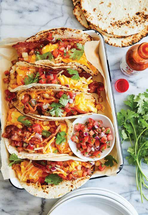 Serve bacon, potatoes and eggs in tortillas with desired toppings.