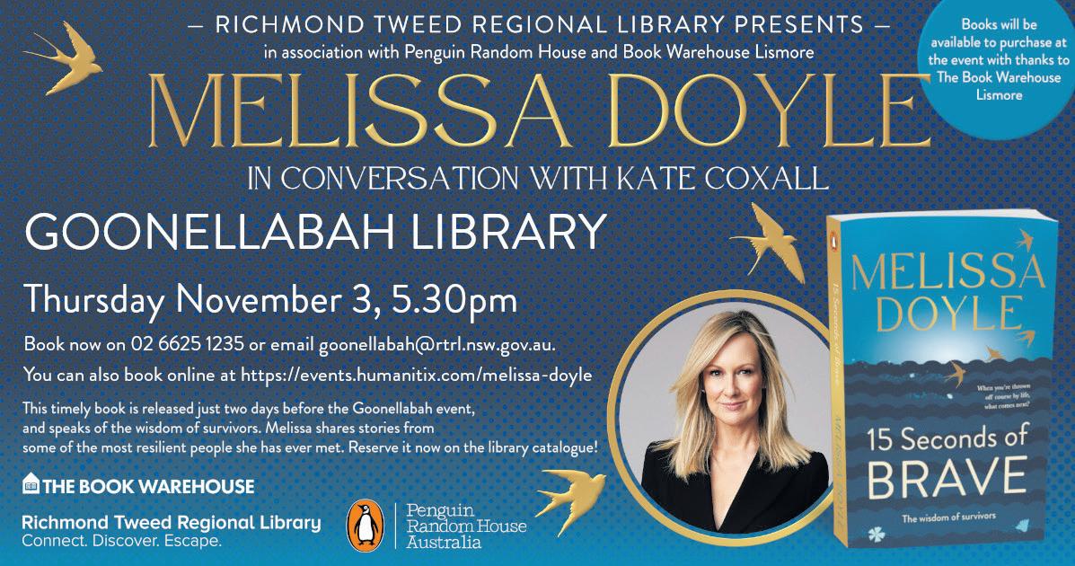 Melissa appears at Goonellabah Library on Thursday November 3, 5.30pm Book now on 02 6625 1235 or email goonellabah@rtrl.nsw. gov.au.