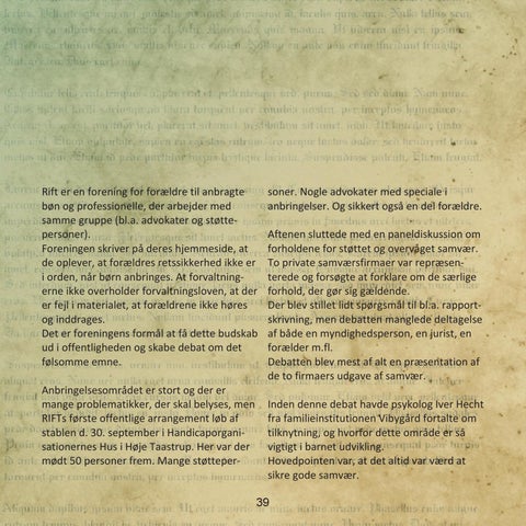 Rift er en forening for forældre til anbragte bøn og professionelle, der arbejder med samme gruppe (bl.a. advokater og støttepersoner). Foreningen skriver på deres hjemmeside, at de oplever, at forældres retssikkerhed ikke er i orden, når børn anbringes. At forvaltningerne ikke overholder forvaltningsloven, at der er fejl i materialet, at forældrene ikke høres og inddrages. Det er foreningens formål at få dette budskab ud i offentligheden og skabe debat om det følsomme emne. Anbringelsesområdet er stort og der er mange problematikker, der skal belyses, men RIFTs første offentlige arrangement løb af stablen d. 30. september i Handicaporganisationernes Hus i Høje Taastrup. Her var der mødt 50 personer frem. Mange støtteper-