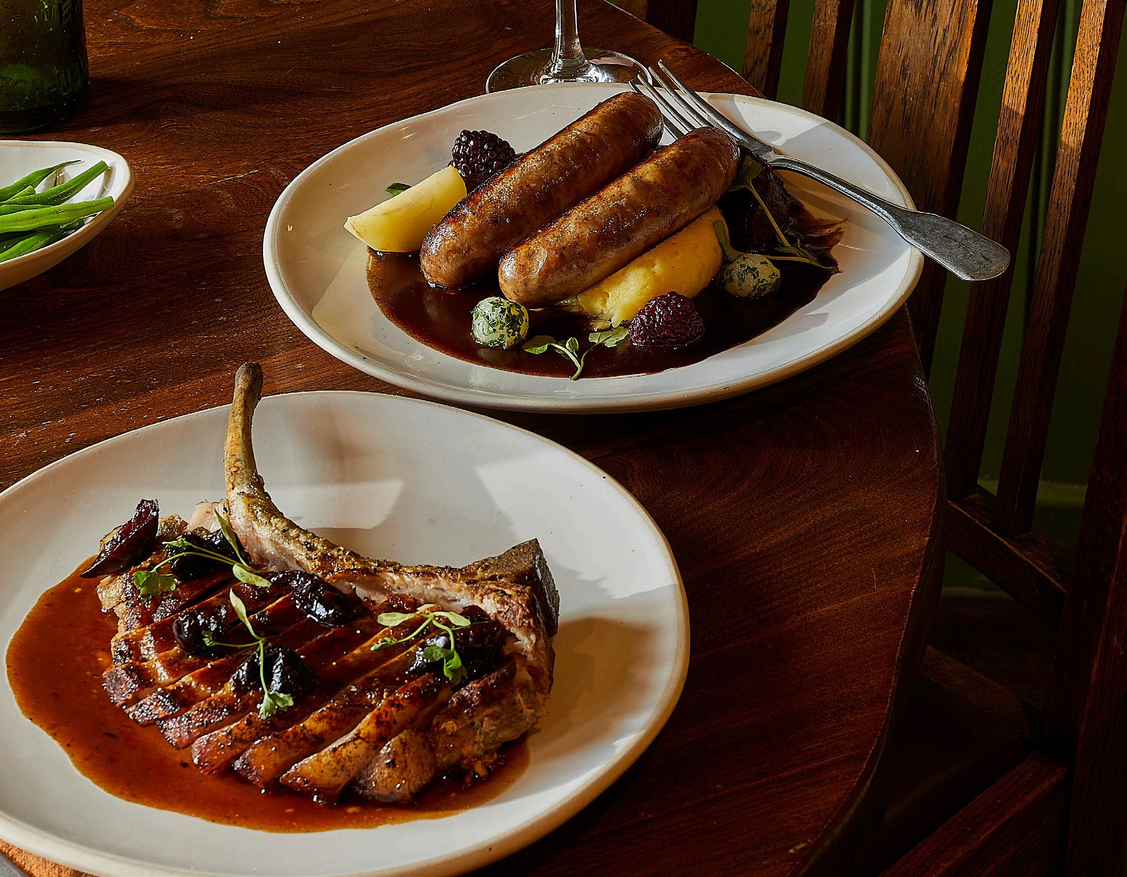 Top Right Pork Tomahawk (front) and Game Sausage with truffle mash (back) from our current Autumn menu
