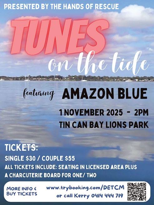 1 ‘Tunes On The Tide’ presented by The Hands of Rescue, 2pm, TCB Lions Park. Live music by Amazon Blue, tickets incl charcuterie board. Beer, wine, soft drinks available for purchase. Tickets/info: www.trybooking.com/DETCM