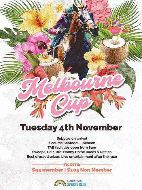 4 Melbourne Cup Luncheon at RB Sports Club. Bubbles on arrival, 2-course Seafood Luncheon, TAB from 8am, Sweeps, Calcutta, Hobby Horse Races, Raffles, Best dressed prizes, Live entertainment. $95 members $105 non members. Book before it sells out: rainbowbeachsportsclub.com.au