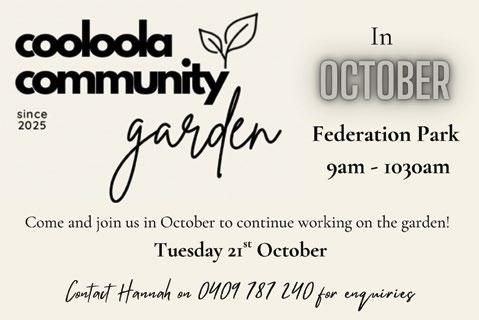 21 Cooloola Community Garden working bee, 9-10.30am, Federation Park. Contact Hannah 0409 787 240. See page 29.