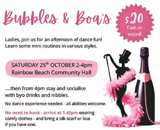 25 Bubbles & Boas, 2-4pm, RB Community Hall. An afternoon of dance fun! No experience needed. $20pp cash on arrival.