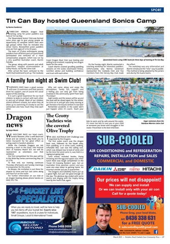 E WELCOME BACK our head coach, Sandra Wooster, after a well-deserved break and we extend a big thank you to Helen Hurworth for her great effort as acting coach in Sandra’s absence. While the Cooloola Dragons are not entering a team in the State Title Festival 2021 at Kawana March 6/7, we will be represented as volunteers over that weekend. Our first competition for this year will be in the Wide Bay Series commencing May 29 at 1770. To that end, our training continues Thursday afternoons and Sunday mornings in preparation for this series. As always, the invitation is out there for anyone to come and try! Just come along and have fun on the water. For further information on our club or on dragon boating please phone Sandra on 0402 352 756.