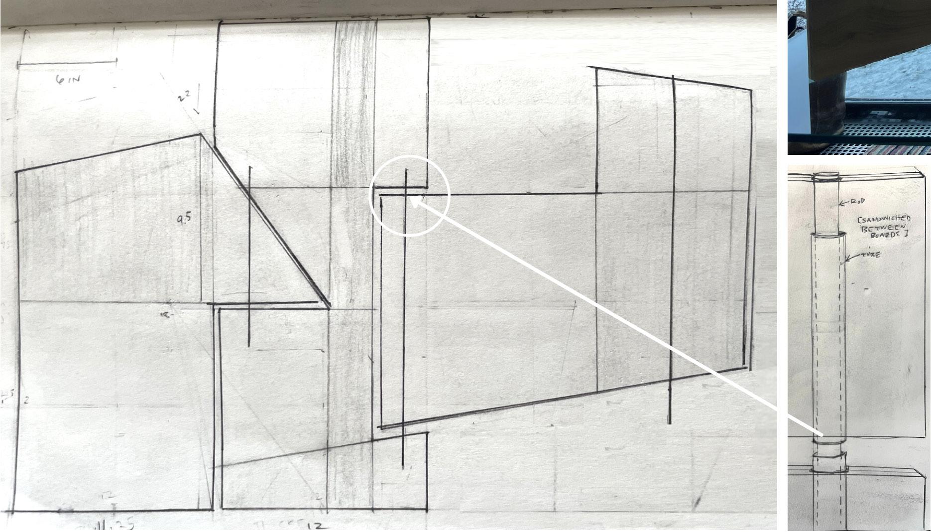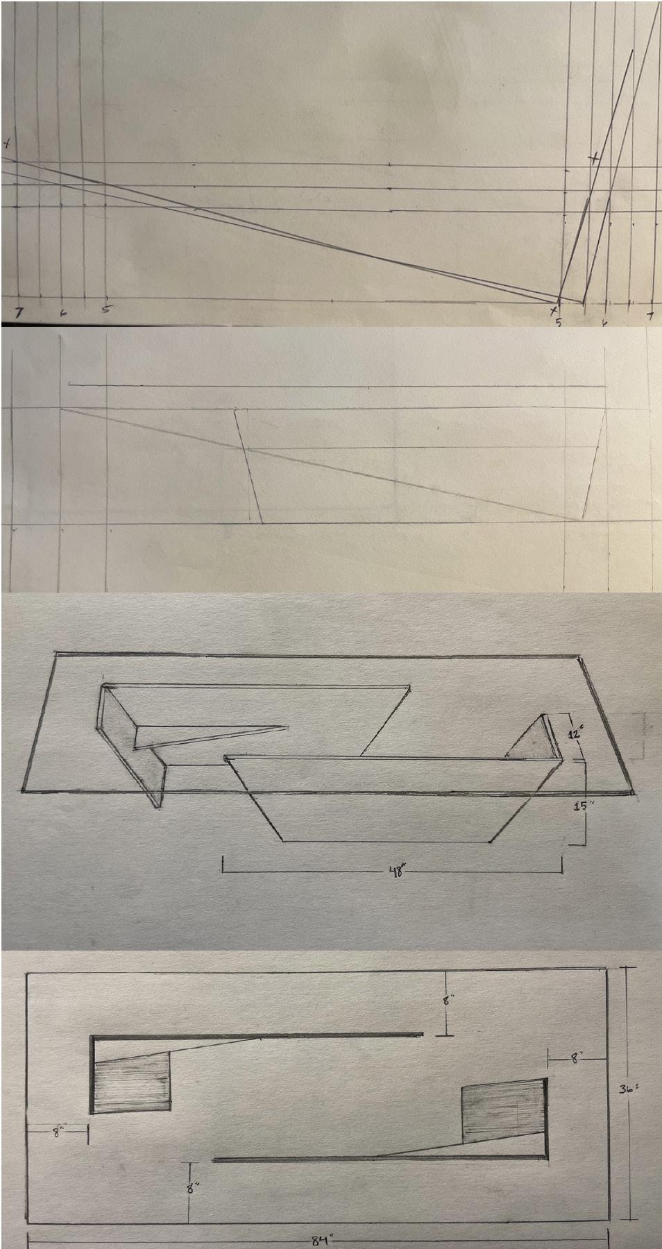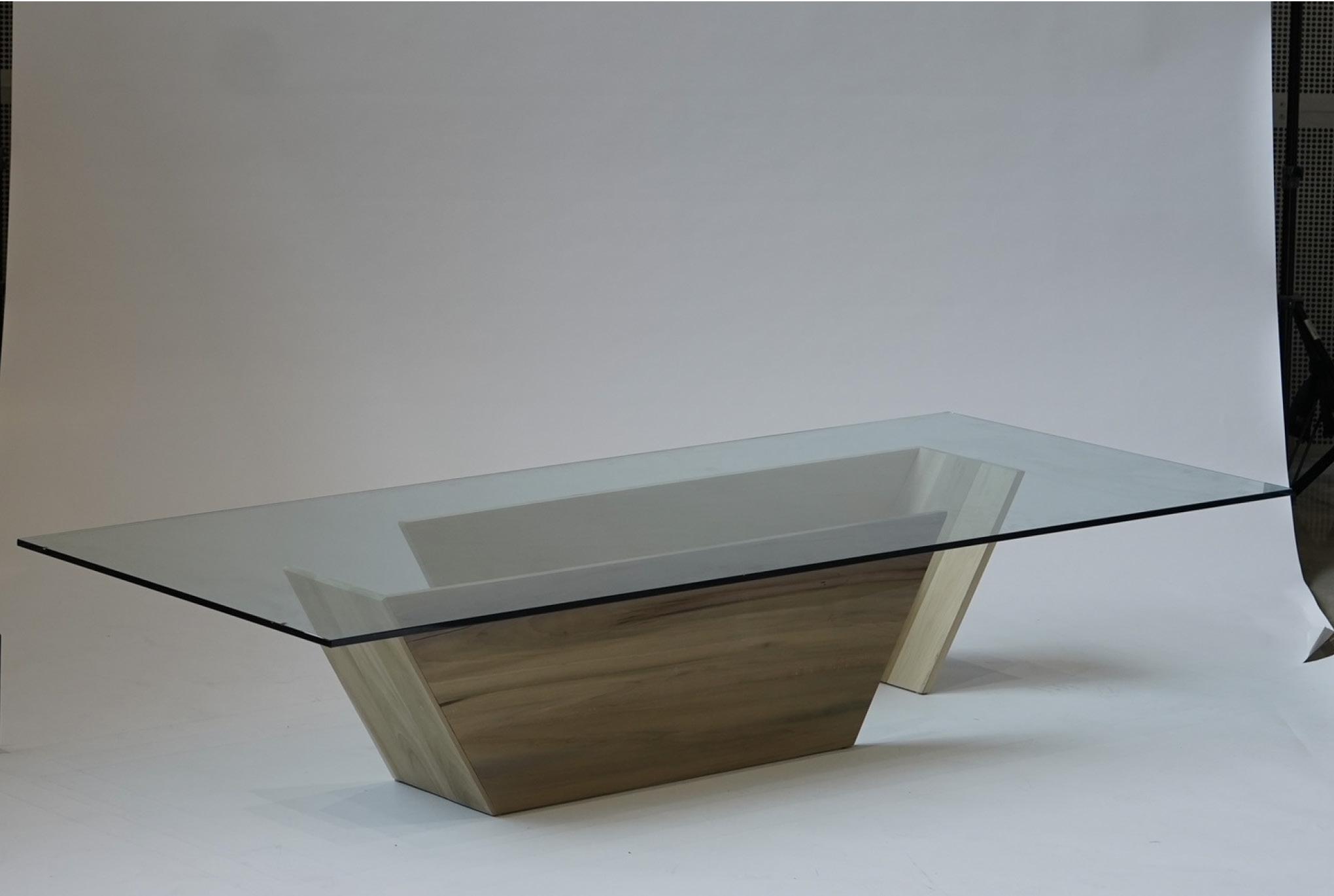 Design engages directly with the transparency of the glass, drawing the gaze through the sheet surface as though looking through a window. Load bearing components are anchored in the corners and extend across the length of the sheet creating a contained space beneath the glass. Angled elements provide functional triangulation and structural integrity while encouraging the eye to move throughout this contained area.