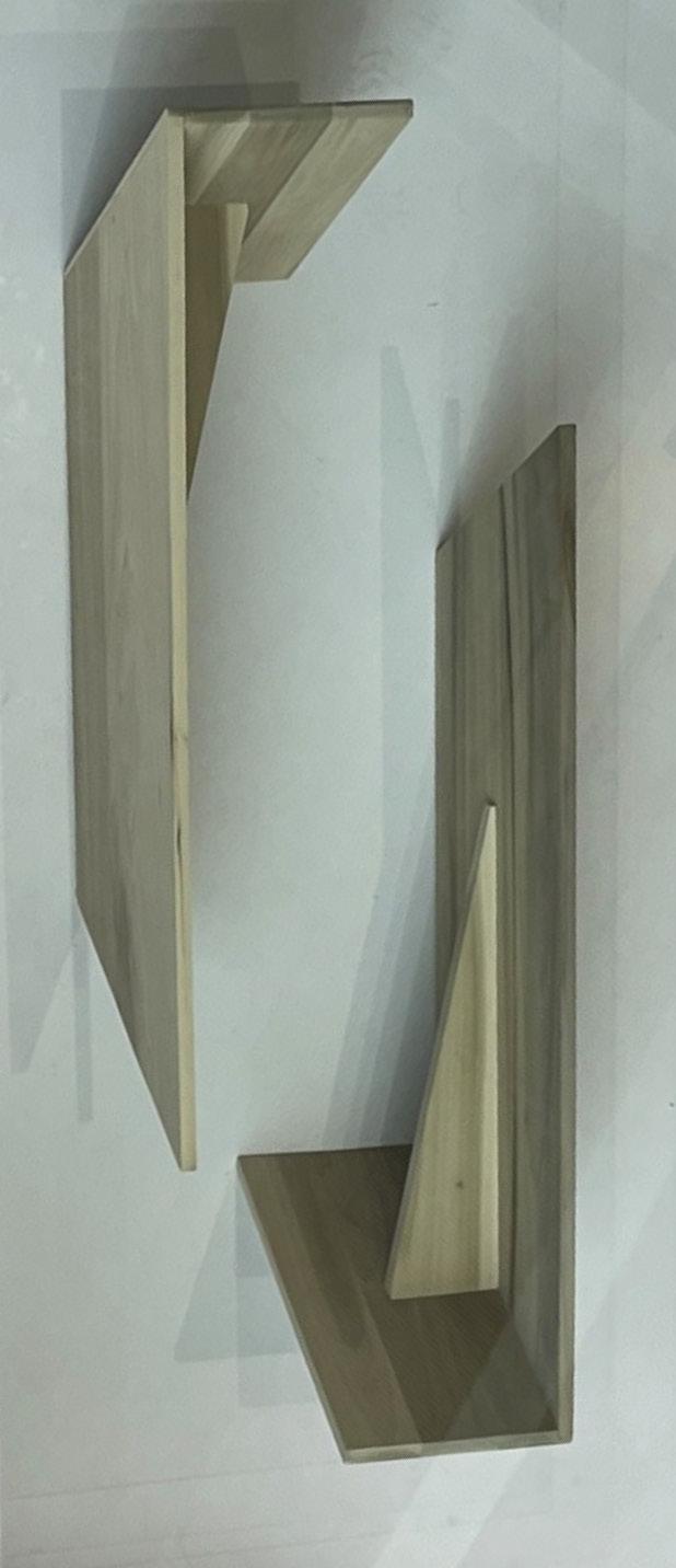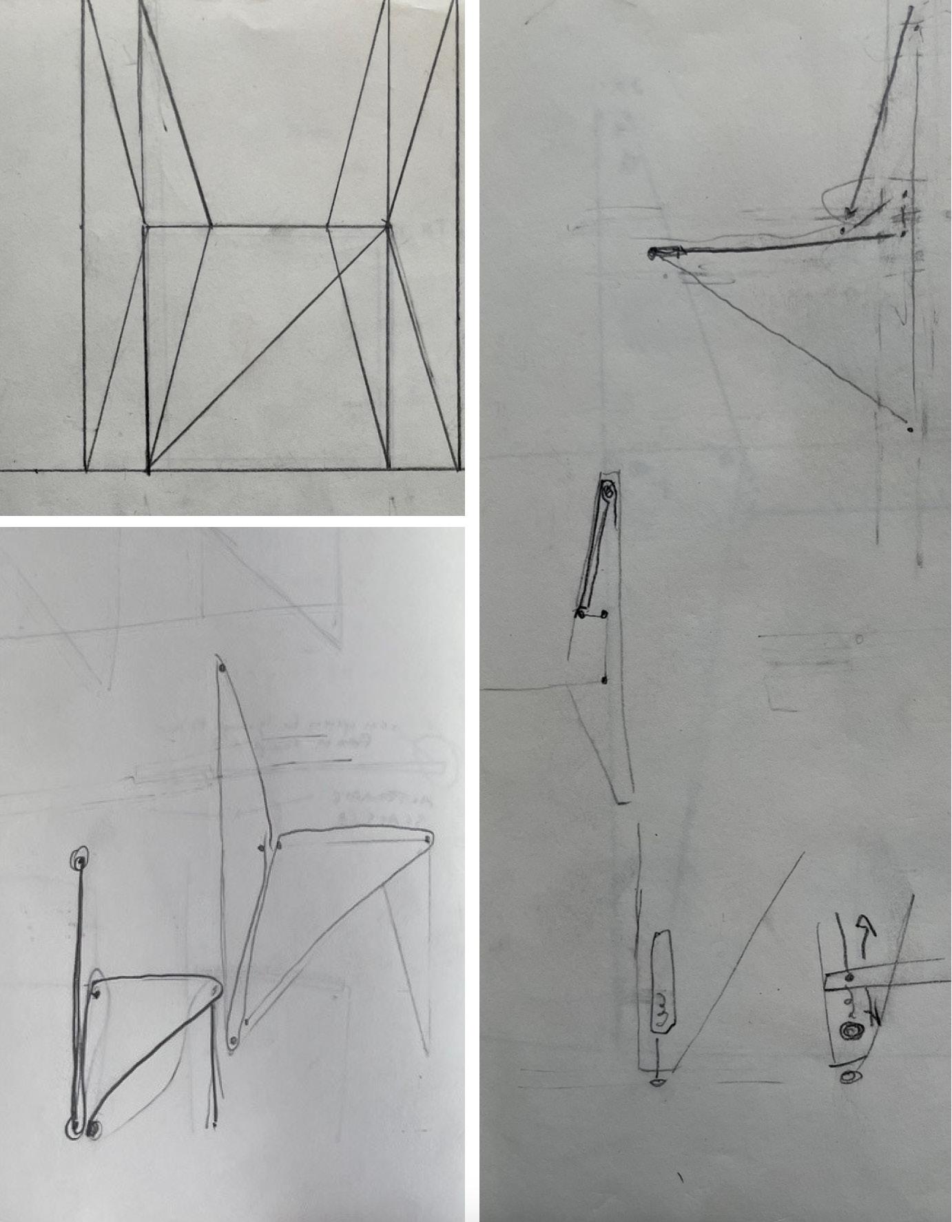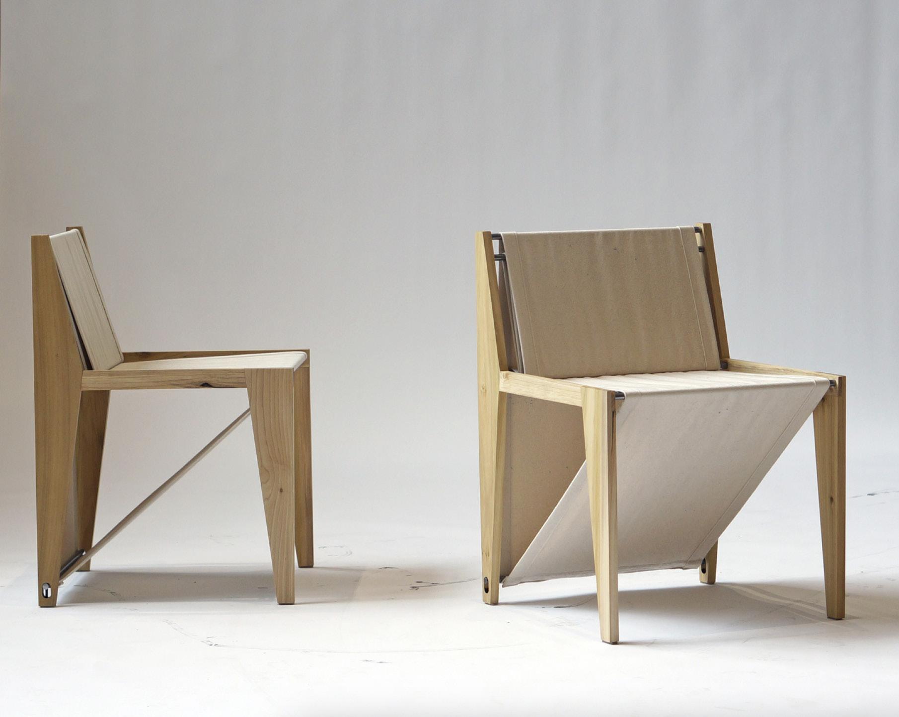 Chairs Exploration of triangulations found in “standard” side chair dimensions. Fabric tensioned in a continuous loop mimics the sharp lines of angled wood. Narrow, chair side planes create an observed perception of precariousness which is relieved by the physical sense of strength established at the junction of fabric settling into steel rod supports when human places trust in object in the act of sitting.