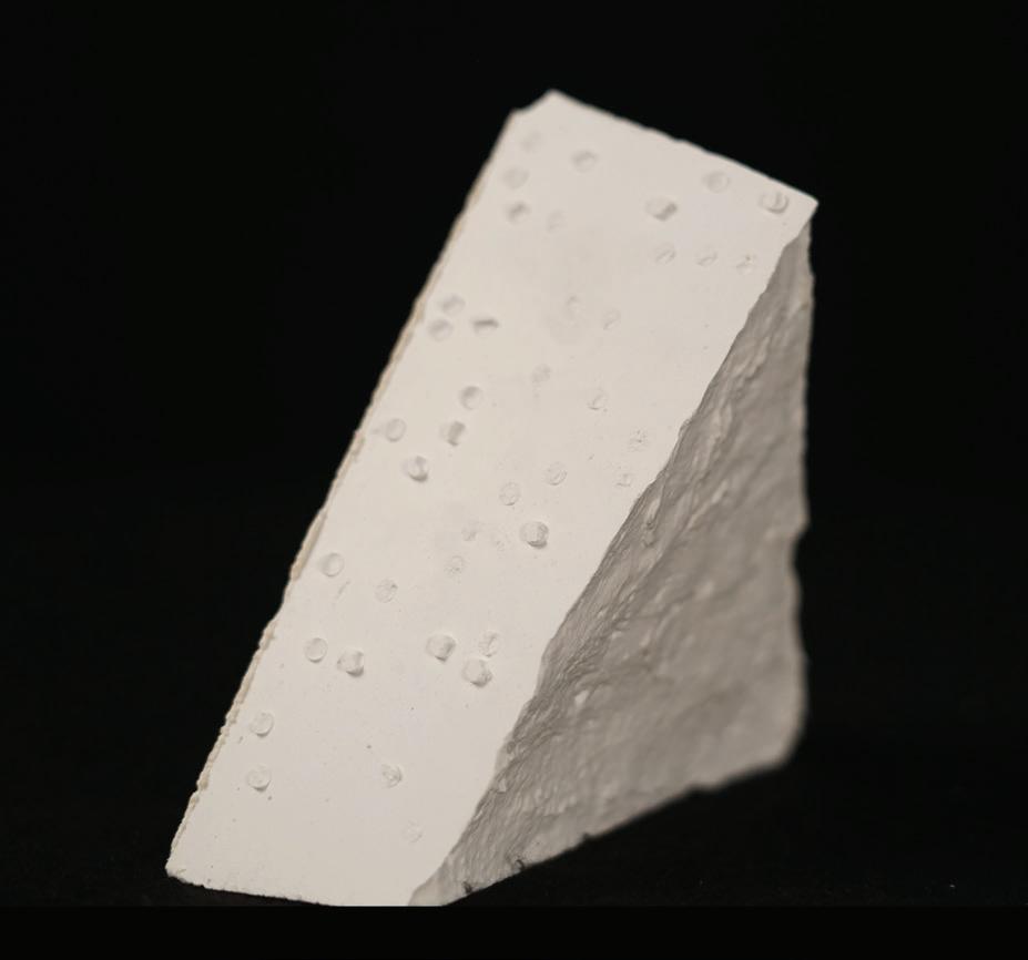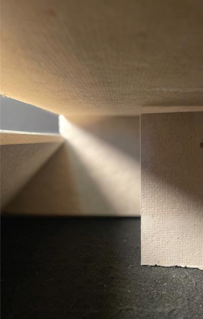 Barrel vault structure spans solid/void spaces and extends beyond the envelope transitioning into exterior detail. Lighting and daylighting are directly connected to barrel vault ceiling details creating connection between interior/exterior, spanning interior solid and void spaces.