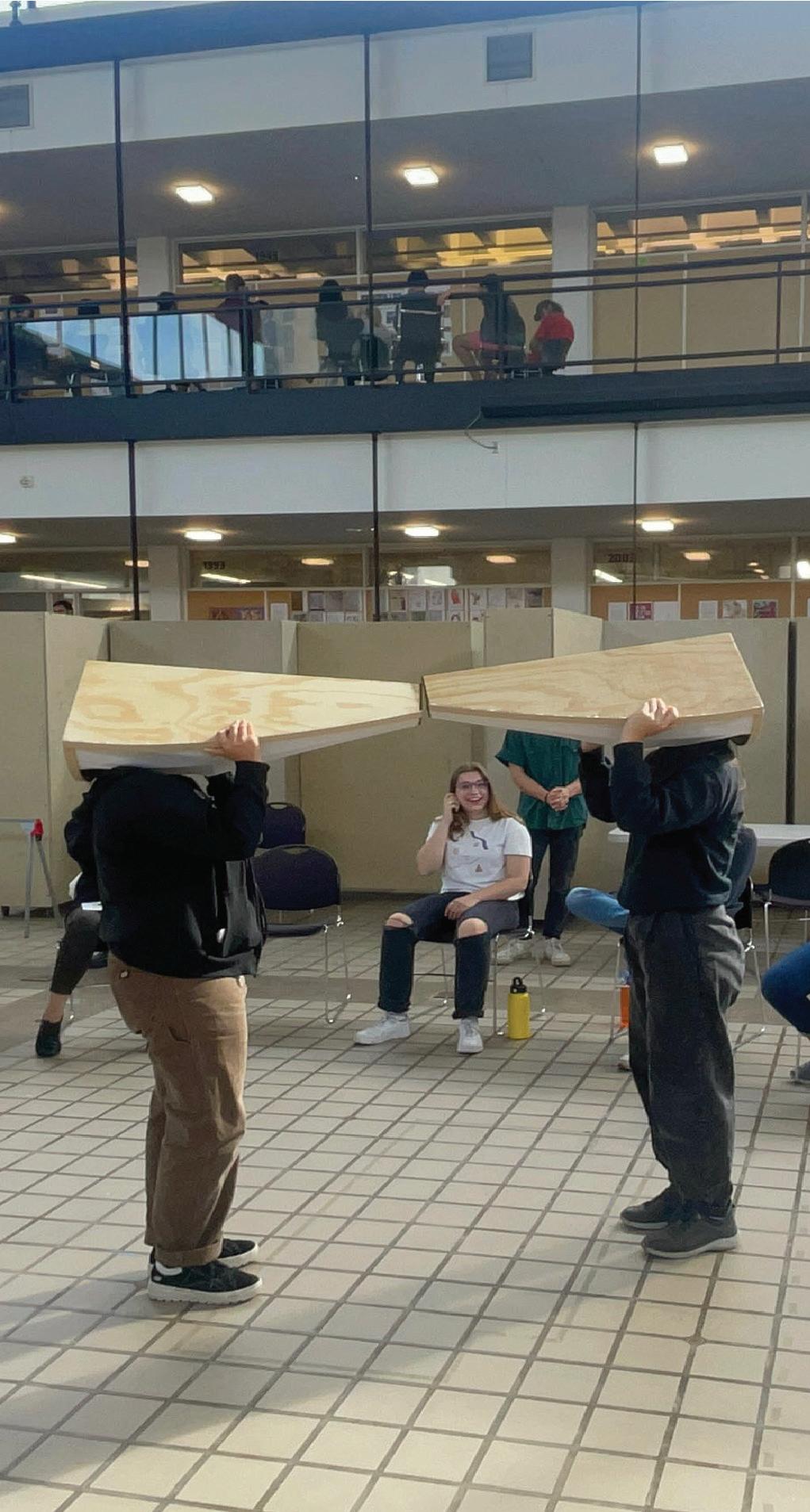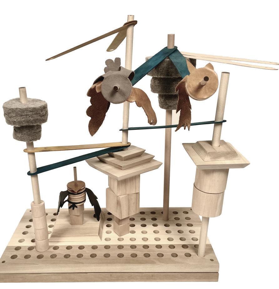 Exploration of Richard Caillois’s mimicry (role play) and the tension between ludus (structured play with explicit rules) and paidia (spontaneous playfulness). Imagination, imitation, and prescribed elements combine to create expotnential possible habitats and inhabitants. Components and connections imply rules through dimensions and materials / dowels and diameters.