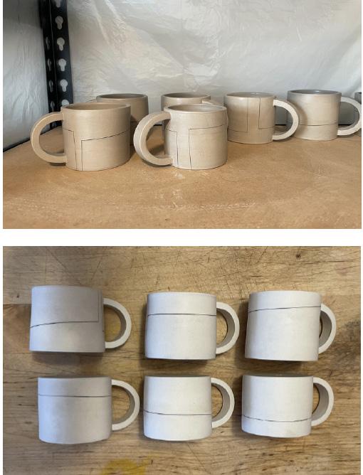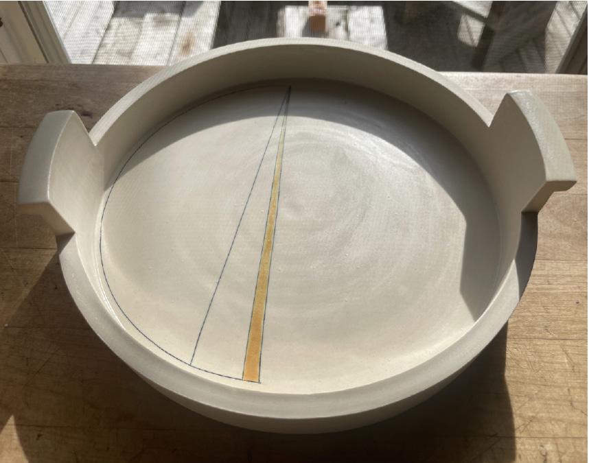 Process seeks to explicate the natural surface of the clay. Inlaid line detail and color blocking apportion visible planes. Exteriors are sanded after firing aligning texture with simplicity and precision in thrown form.