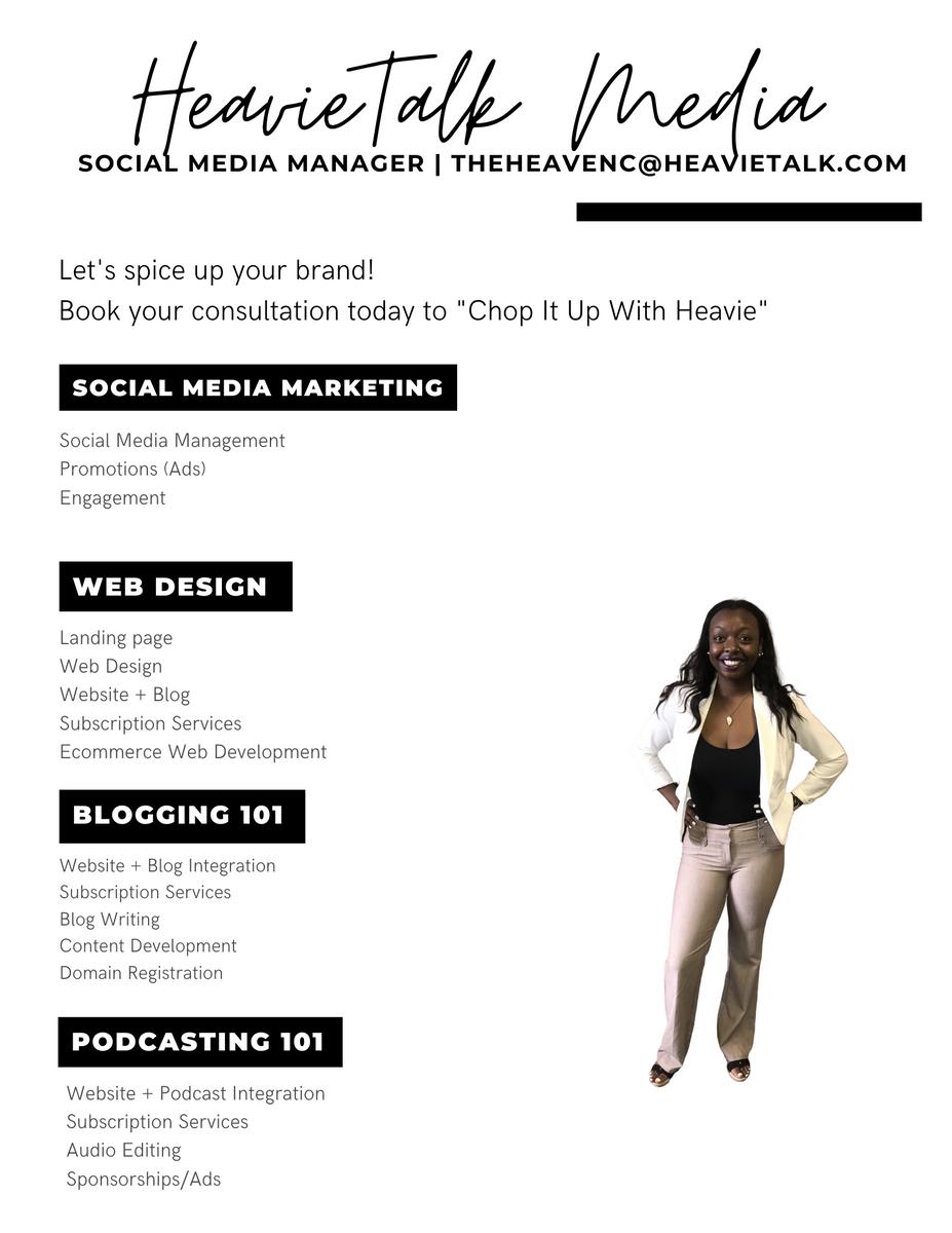 HeavieTalk Media is a media HeavieTalk Media is a media company that creates and company that creates and produces content and brands produces content and brands including TheBlack.Blog and including TheBlack.Blog and HeavieTalk, in addition to HeavieTalk, in addition to offering freelance social media offering freelance social media marketing and branding marketing and branding services. services.