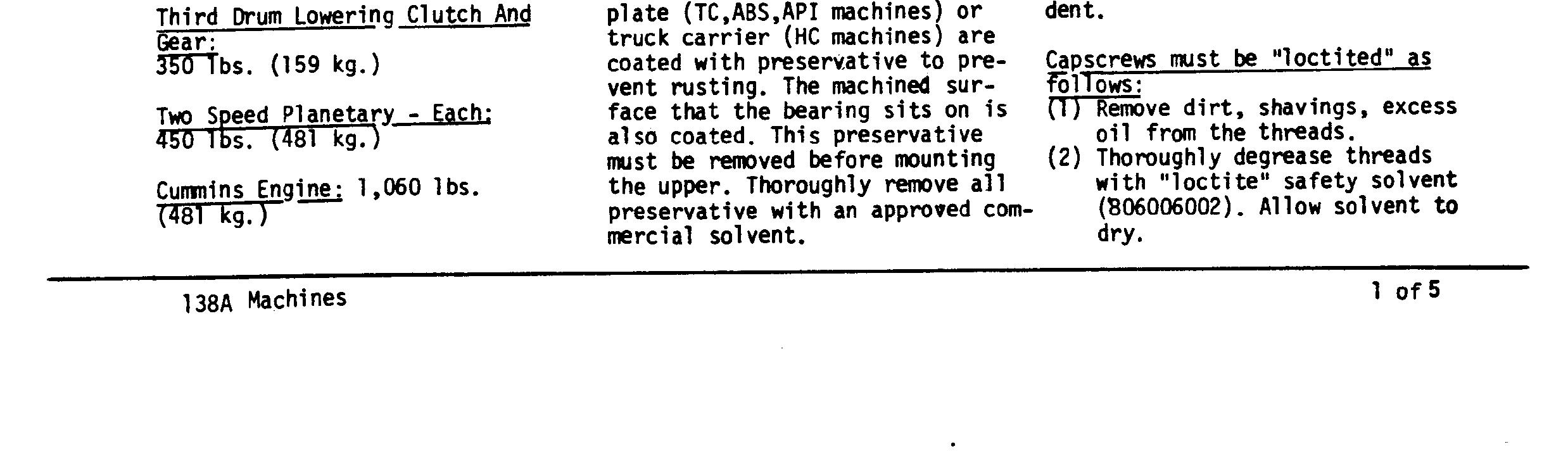 (g} Start upper engine. Engage master clutch. Release swing lock. Release swing brake. Release the lifting equii:-nent. slowly swing upper until rrore capscrews can be installed. Coat all capscrews with "loctite" as explained on page 1. Continue this procedure until all 38 capscrews are installed, turned in by hand until head contacts bearing surface, then initially tightened to 500 ft/lbs. (668 N,m) torque.