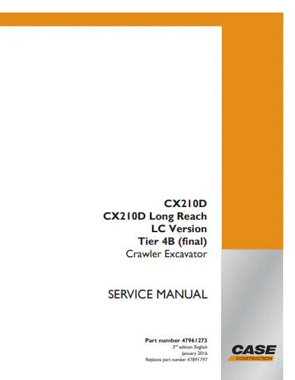 Case CX210D Long Reach LC Version Tier 4B Service Manual 47961273 PDF – Comprehensive technical documentation for the Case CX210D excavator. This official service manual covers maintenance, diagnostics, repair procedures, and component specifications for the long reach LC configuration with Tier 4B emissions compliance. Essential reference for technicians, operators, and fleet managers requiring detailed mechanical and hydraulic system information. Digital PDF format enables quick access to critical service data and troubleshooting guidance.