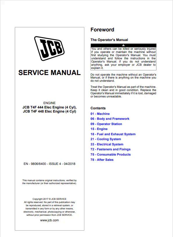 JCB T4F 444 and T4F 448 Electronic Engine Service Manual (9806/6400) provides comprehensive technical documentation for maintenance, troubleshooting, and repair procedures. This professional-grade manual covers engine specifications, diagnostic protocols, component assembly, and operational guidelines. Essential reference for technicians, mechanics, and service centers performing scheduled maintenance or addressing mechanical issues. Includes detailed schematics, torque specifications, and step-by-step instructions. Available in PDF format for immediate digital access and convenient reference on job sites or in workshops.