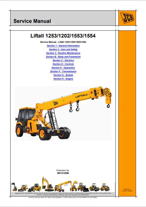 JCB Liftall 1253, 1202, 1553, 1554 Service Manual 9813/1650 PDF Comprehensive service manual for JCB Liftall telehandler models 1253, 1202, 1553, and 1554. Document reference 9813/1650 provides detailed technical specifications, maintenance procedures, troubleshooting guides, and repair instructions. Essential resource for technicians, operators, and maintenance personnel requiring factory-authorized documentation. Covers hydraulic systems, engine components, electrical circuits, and structural assemblies. Digital PDF format enables quick reference and easy distribution across your service team.