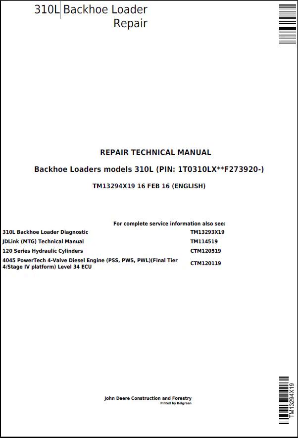 John Deere 310L Backhoe Loader Repair Technical Manual TM13294X19 provides comprehensive service and maintenance guidance for operators and technicians. This official documentation covers diagnostic procedures, component specifications, troubleshooting protocols, and step-by-step repair instructions for the 310L model. Essential for maintaining equipment performance, extending machine lifespan, and ensuring safe operation. Ideal for fleet managers, service centers, and equipment owners requiring authoritative technical reference material.