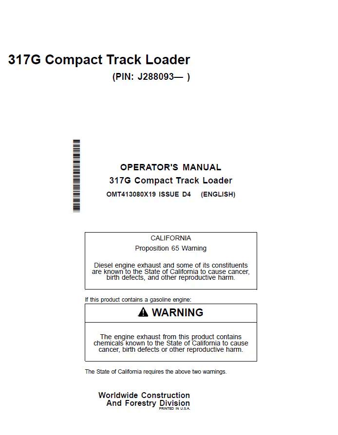 The John Deere 317G Compact Track Loader Operator Manual OMT413080X19 is an essential reference document for equipment operators and maintenance personnel. This comprehensive PDF guide covers operation procedures, safety protocols, maintenance schedules, and troubleshooting information specific to the 317G model. Ideal for training new operators, ensuring compliance with manufacturer specifications, and maximizing equipment performance and longevity. Digital format allows instant access across devices for on-site or office reference.