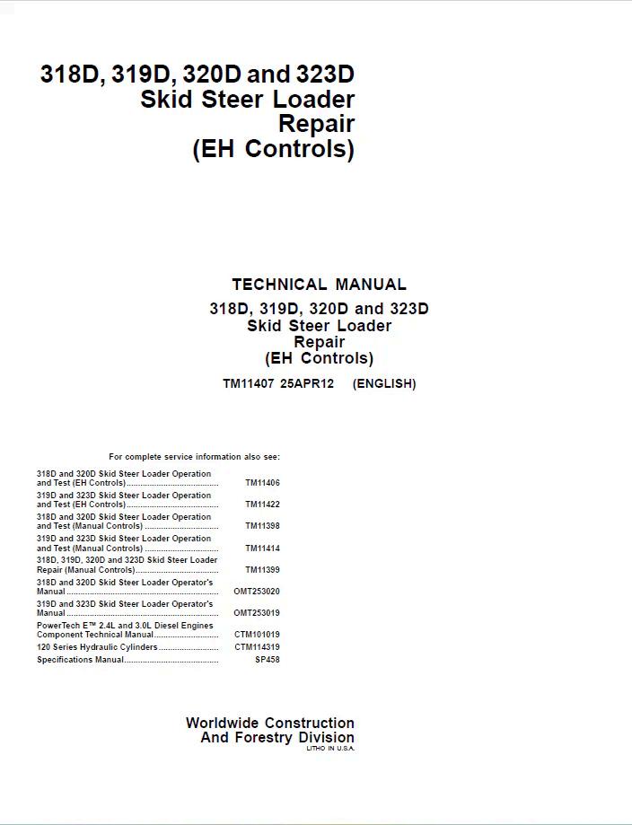 John Deere 318D, 319D, 320D and 323D Loader Technical Manual TM11407 PDF – Comprehensive service and repair documentation for compact wheel loaders. This official manual covers diagnostics, maintenance procedures, hydraulic systems, engine specifications, and troubleshooting for all four models. Essential reference for technicians, operators, and equipment managers requiring detailed technical guidance. Digital PDF format ensures immediate access to critical information for efficient equipment maintenance and repair operations.