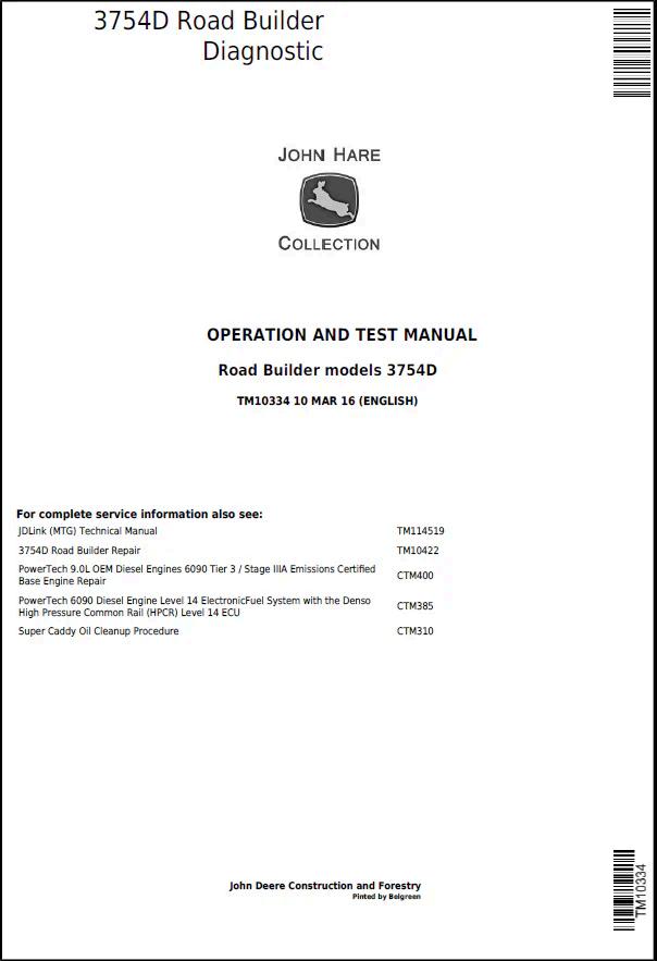 John Deere 3754D Road Builder Operation and Test Manual TM10334 provides comprehensive technical documentation for operating, maintaining, and troubleshooting this heavy-duty road construction equipment. This PDF manual delivers detailed specifications, step-by-step operational procedures, diagnostic protocols, and service guidelines essential for equipment operators and maintenance technicians. Ideal for fleet managers, contractors, and field personnel requiring authoritative reference material to maximize equipment performance and ensure safe, efficient operation in demanding road-building applications.