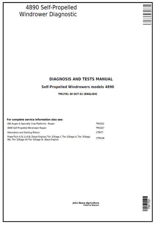 John Deere 4890 Self-Propelled Windrower Diagnostic Diagnosis and Tests Manual TM1781 provides comprehensive technical guidance for troubleshooting and servicing this heavy-duty hay equipment. This PDF manual delivers detailed diagnostic procedures, system tests, and repair specifications essential for technicians and operators maintaining peak performance. Access critical information on engine diagnostics, hydraulic systems, transmission function, and electrical components. Ideal for authorized dealers, service centers, and experienced operators requiring factory-level technical documentation to resolve issues efficiently and minimize downtime.