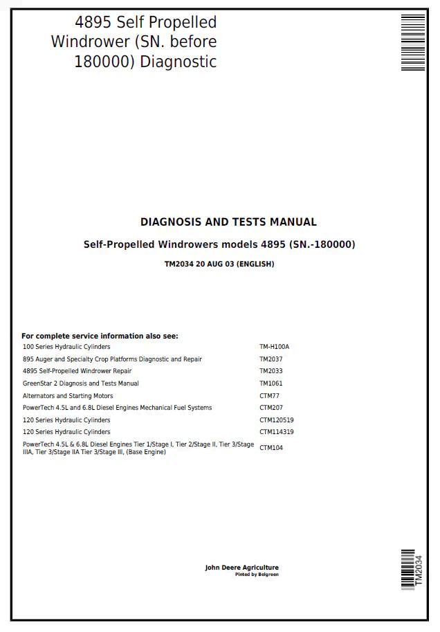 John Deere 4895 Self Propelled Windrower Diagnosis and Test Manual TM2034 provides comprehensive technical guidance for service technicians and equipment operators. This official documentation covers diagnostic procedures, troubleshooting protocols, and testing methodologies specific to the 4895 model. Access detailed schematics, component specifications, and step-by-step repair instructions to maintain peak performance and resolve operational issues efficiently. Essential reference material for authorized dealers and maintenance professionals managing this heavy-duty hay equipment.