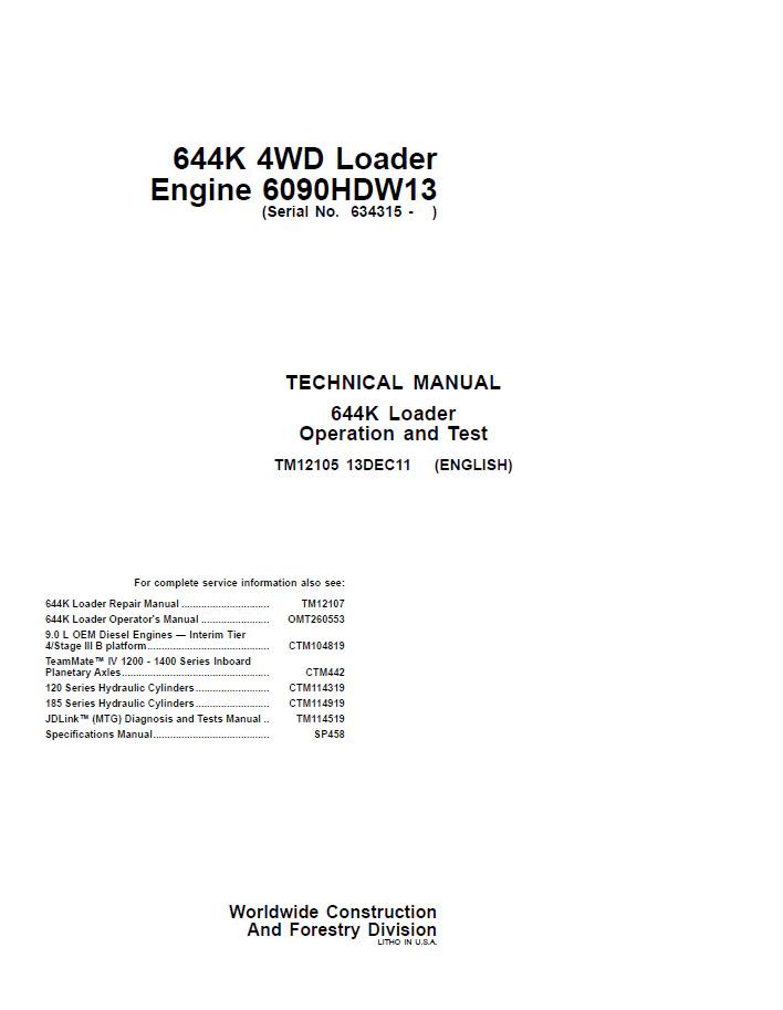 John Deere 644K 4WD Loader Technical Manual TM12105 PDF – the definitive service and repair resource for this heavy-duty wheel loader. This comprehensive manual covers engine specifications, hydraulic systems, transmission operation, electrical schematics, and maintenance procedures. Essential for technicians, operators, and fleet managers requiring detailed troubleshooting guidance and component replacement protocols. Instant digital access ensures your team has critical technical information on-site whenever needed.