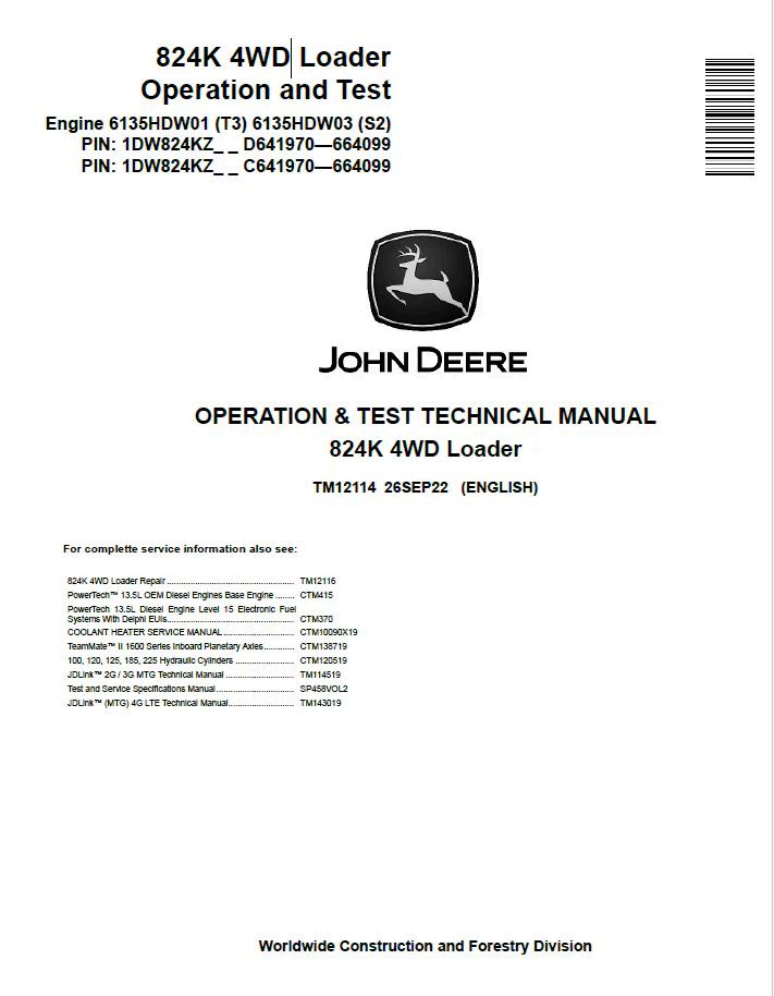 John Deere 824K 4WD Loader Operation and Test Technical Manual TM12114 provides comprehensive guidance for operators and technicians. This official documentation covers machine operation, maintenance procedures, diagnostic testing, and troubleshooting protocols specific to the 824K model. Essential for fleet managers, equipment operators, and service personnel who require detailed specifications and performance standards. Digital PDF format ensures immediate access to critical technical information for training, reference, and compliance purposes.