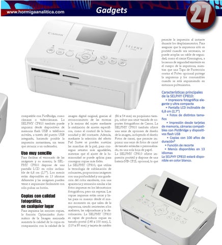 • Impresora fotográfica elegante y ultra compacta • Pantalla LCD inclinable de 6,8 cm (2,7”) • Fotos de distintos tamaños • Impresión desde tarjetas de memoria, cámaras compatibles con PictBridge y dispositivos flash USB • Copias con 100 años de duración² • Función de recorte • Menús disponibles en 13 idiomas La SELPHY CP810 estará disponible en color blanco.