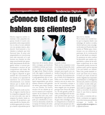 lejos de los clientes. Por lo menos eso sucedió hasta que la empresa diseño una estrategia de medios sociales, donde optó por crear una página de marca en Facebook y una cuenta en Twitter para comunicarse con sus audiencias y participar de la conversación que se está dando en internet. La presencia en estos medios ha permitido que nuestro emprendedor, a pesar de las múltiples ocupaciones de su vida corporativa, pueda conocer de primera mano qué les importa y de qué hablan sus clientes. Mejor aún, puede también conocer qué dicen de su marca, lo bueno y lo malo. Si bien los medios digitales han impactado positivamente la investigación del mercado, desde su creación; los medios sociales están permitiendo que muchos empresarios exitosos regresen al mostrador y escuchen de primera mano lo que dicen y esperan sus clientes. Los invito a comentar este artículo o enviarme sus sugerencias sobre temas para próximas entregas a través de carlos.jimenez@tendenciasdigitales.com y @carlosjimenez
