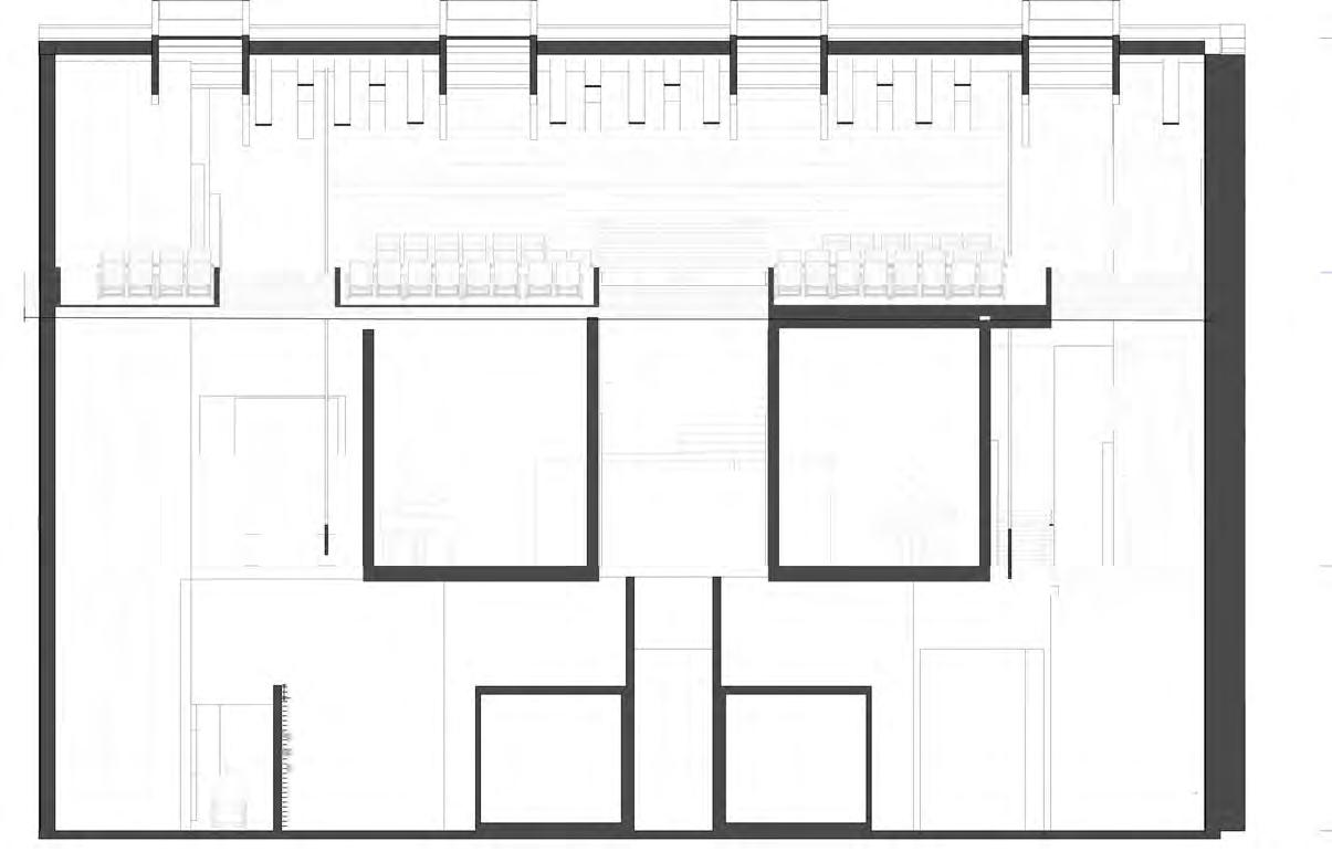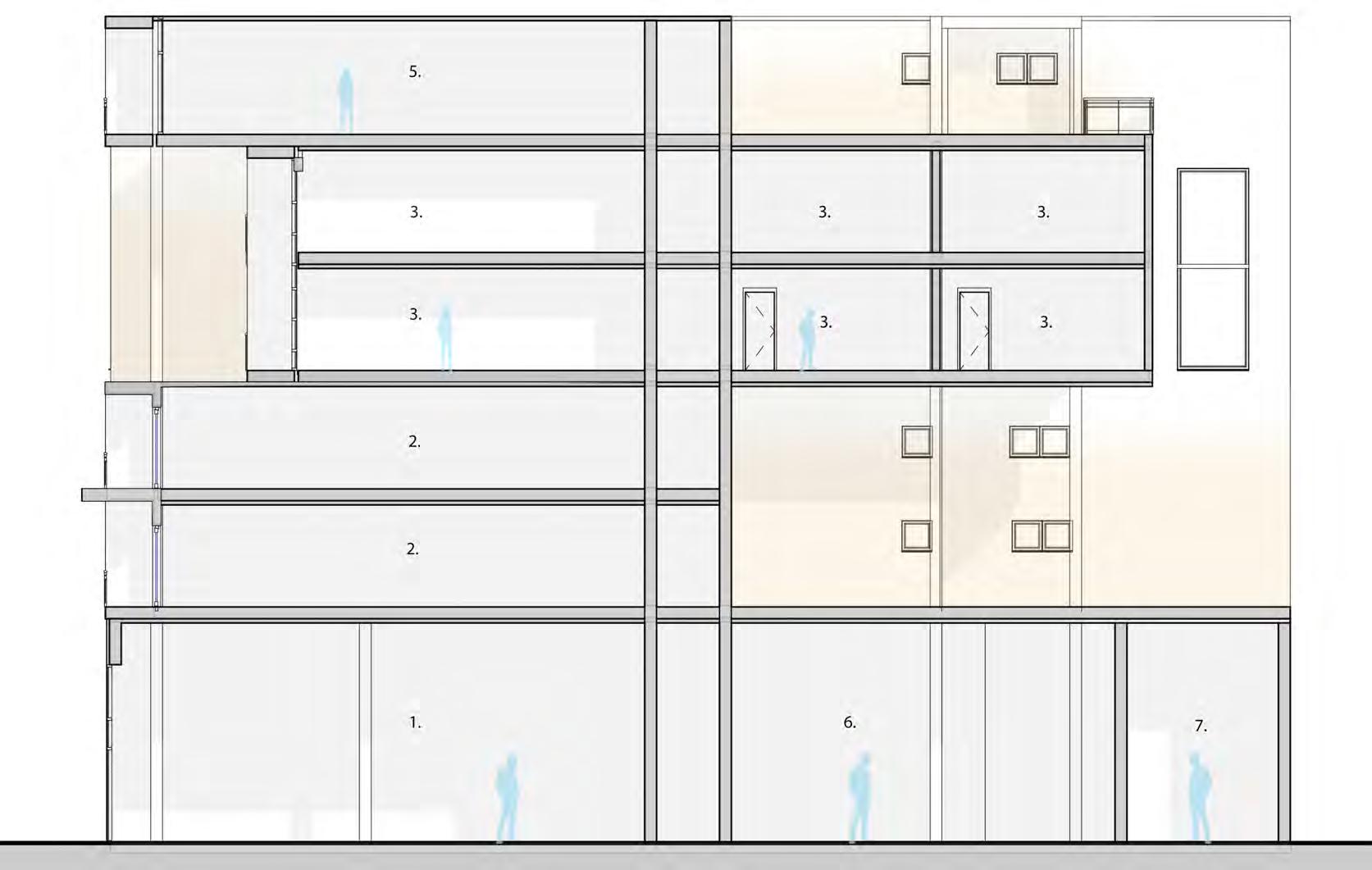 FIRST FLOOR PLAN: 1. MEC, 2. STORAGE, 3.LOCKERS AND SHOWERS, 4. FIRE EXIT STAIR, 5. ELEVATOR, 6.CEREMONIAL STAIR, 7.