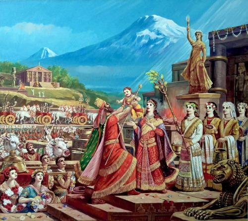 Pintura del Reino de La Gran Armenia, obra del pintor armenio Rubik Kocharian, destacando al fondo las Montañas Sis y Masis, guardianes sagrados del imperio.